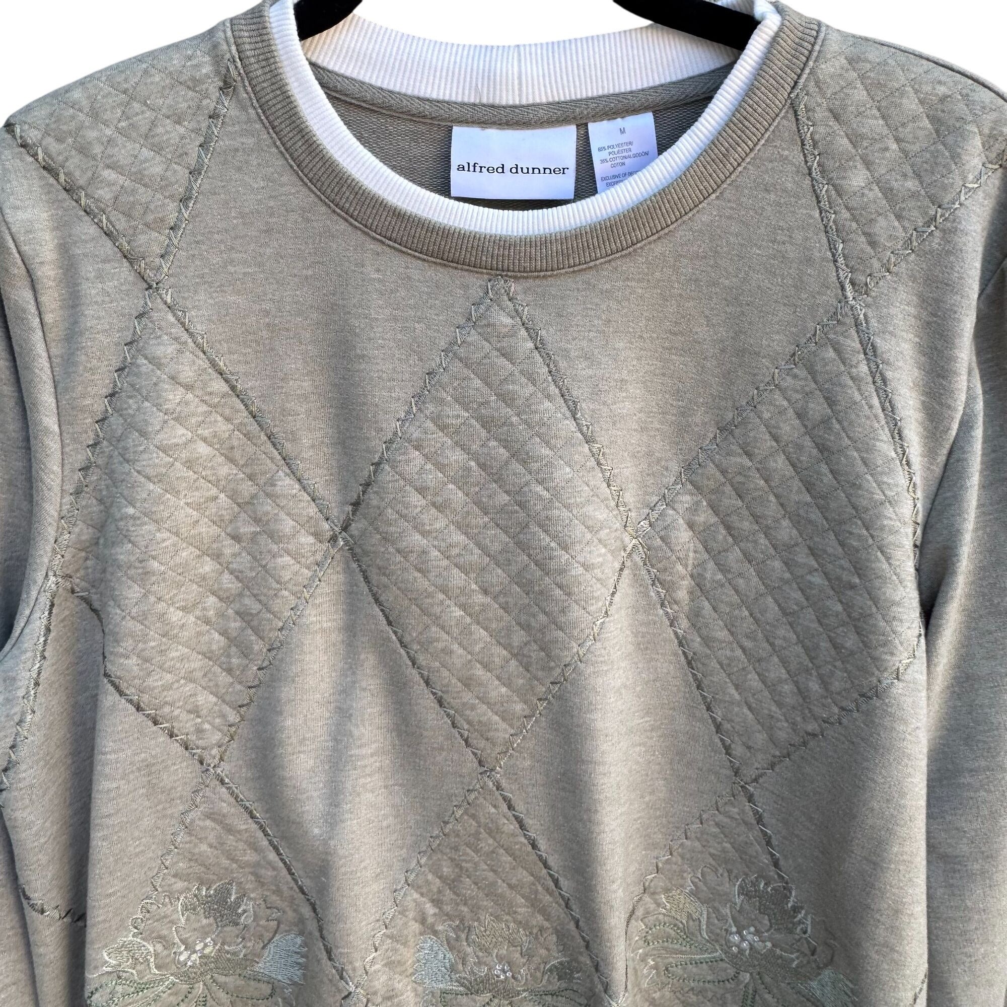 Alfred Dunner Womens Quilted Sweatshirt M Green Floral Embellished Pullover