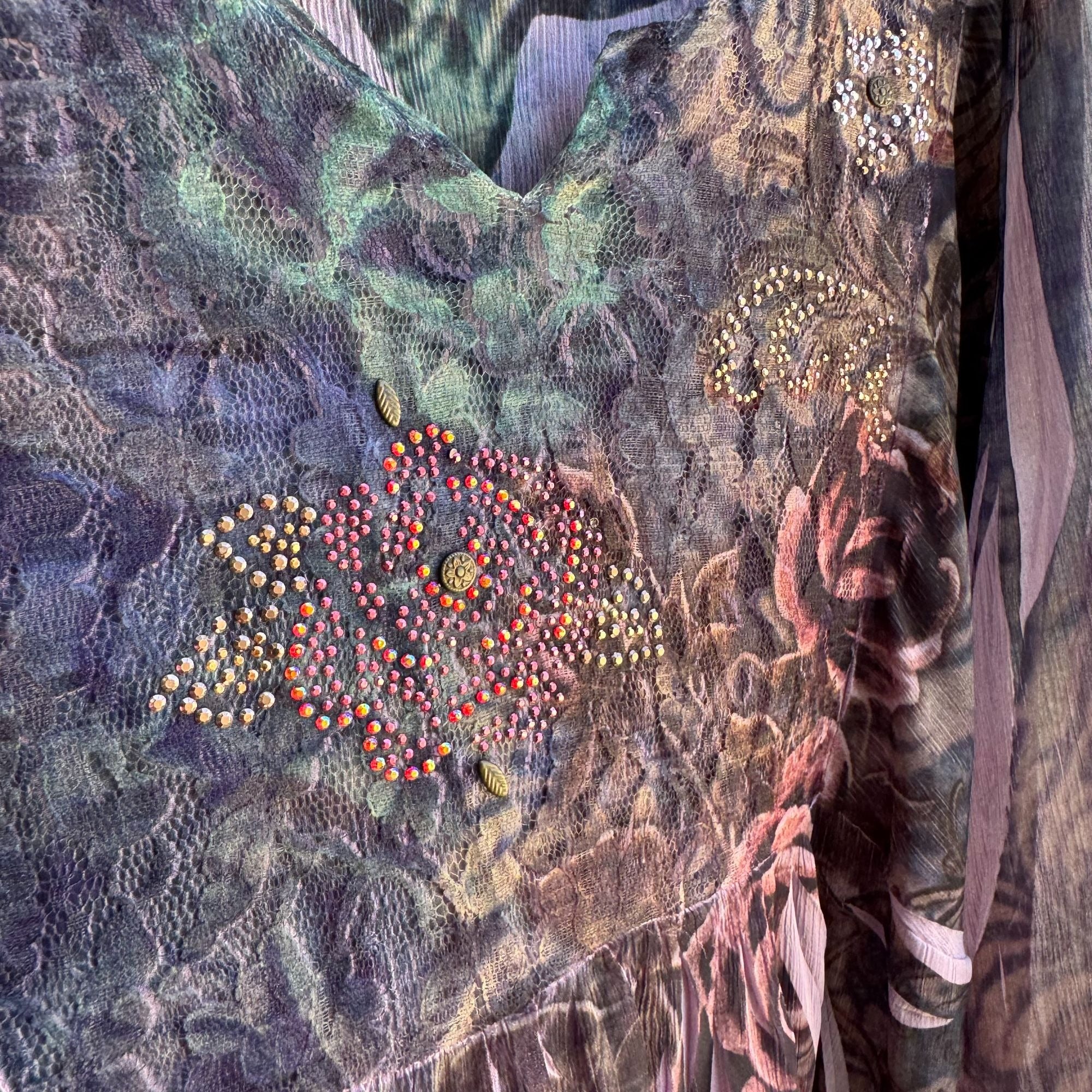 B.L.E.U. Floral Embellished Boho Lace Back 3/4 Sleeve Flowy Tunic Blouse Top XL
