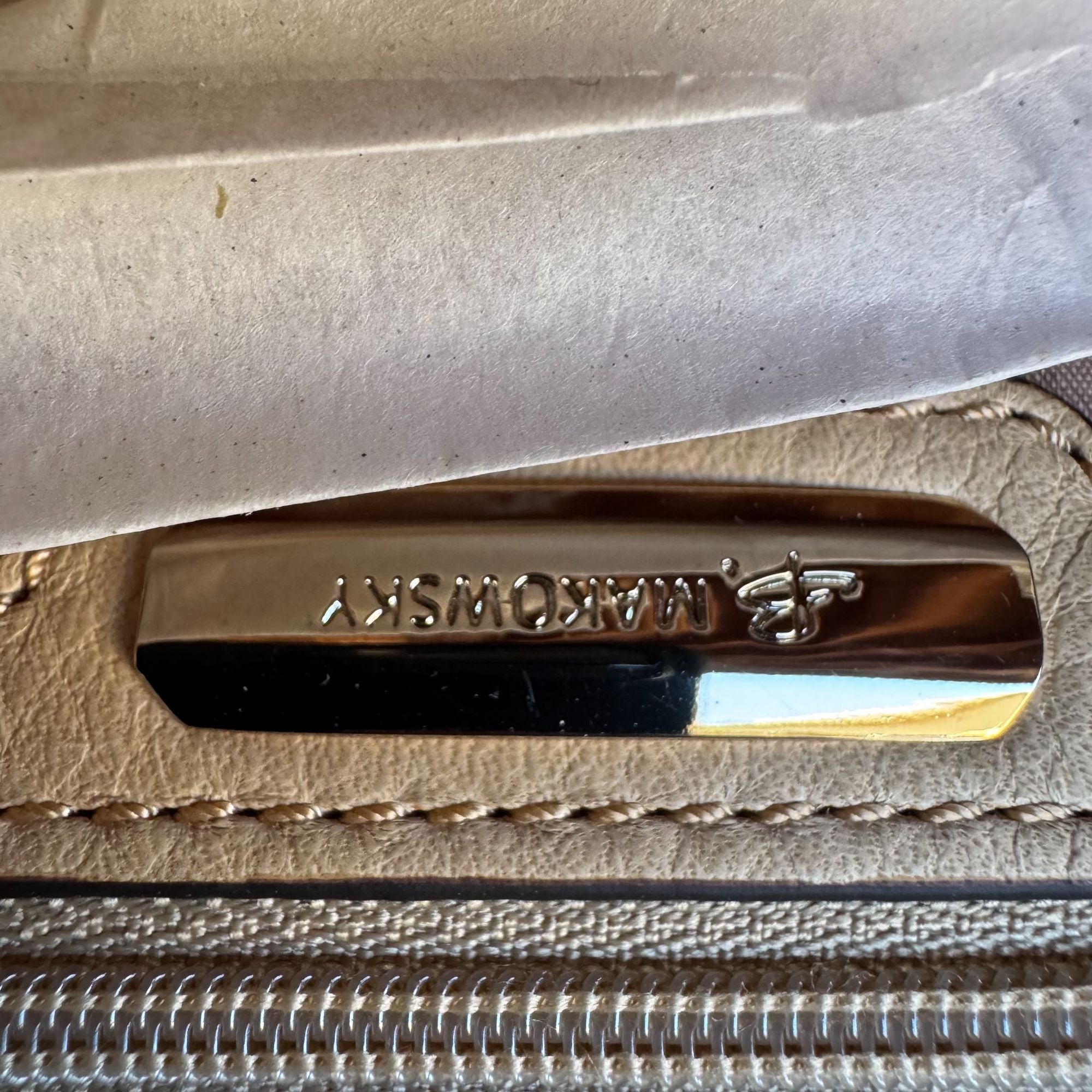 B Makowsky Beige Leather Shoulder Bag With Chain Strap & Gold Hardware