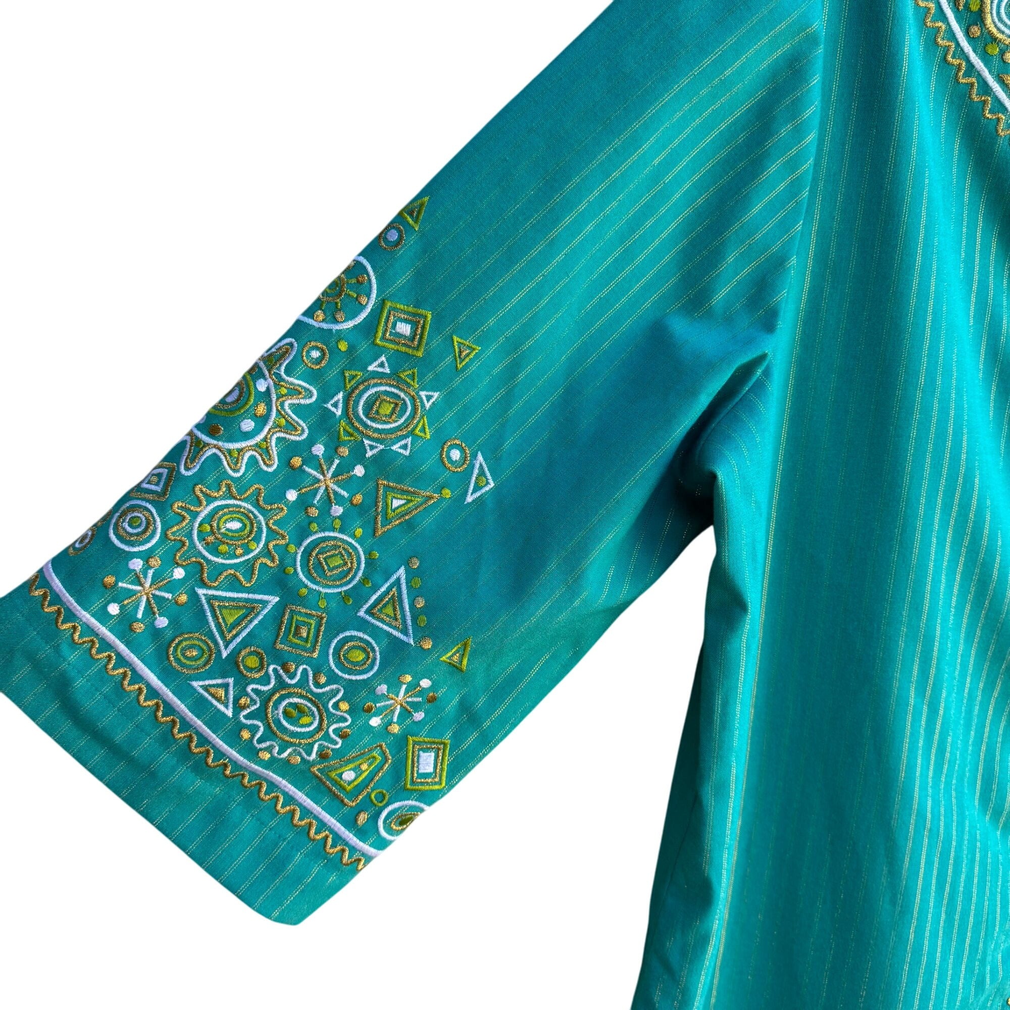 This tunic is like a party for your torso, complete with intricate embroidery and golden accents. Not just a top, it's a conversation starter. Wear it, and suddenly you're the star of your own art exhibit. Versatile for various occasions, it adds a splash of creativity to your wardrobe.
