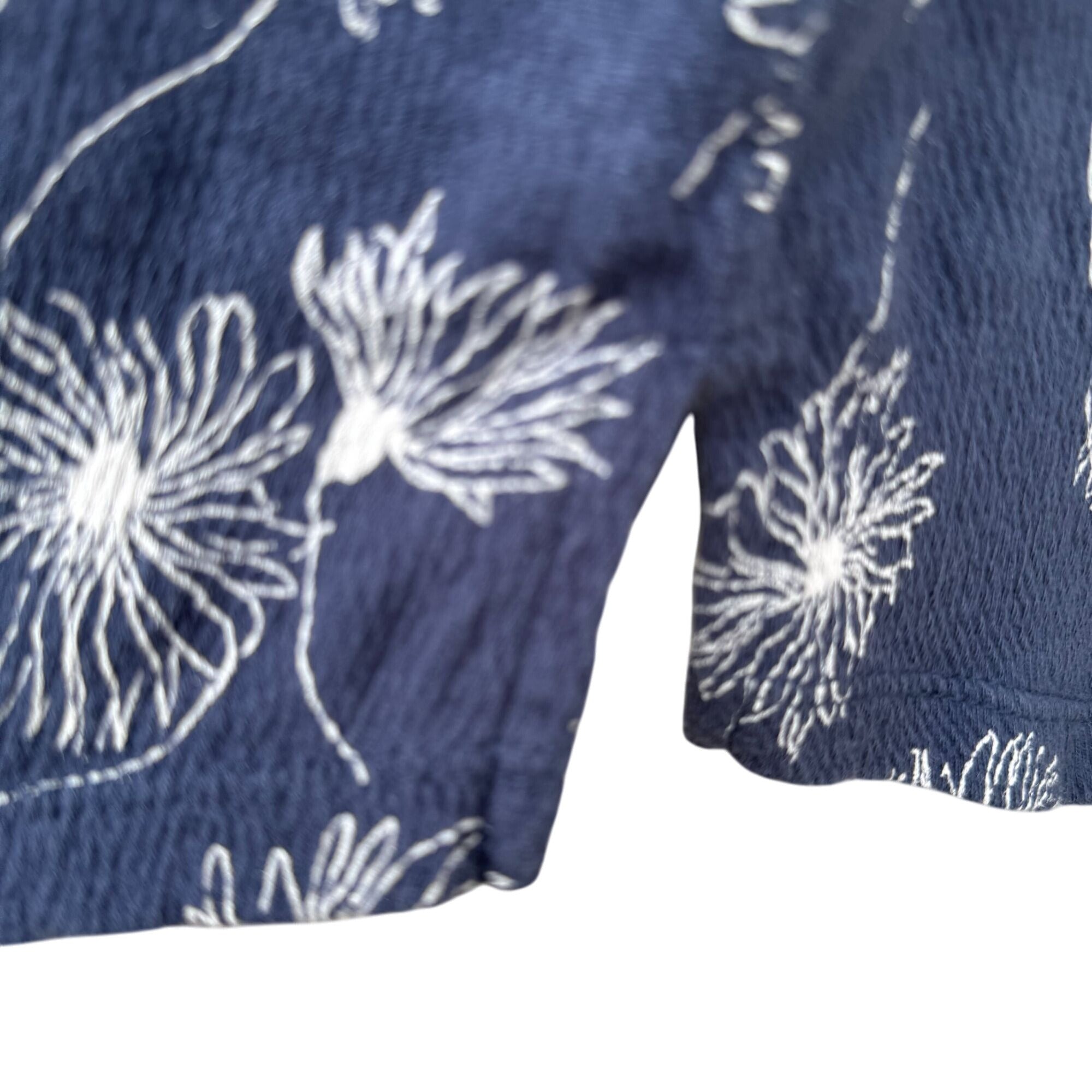 This lightweight and breathable waffle knit top combines elegance and comfort, featuring a charming floral design on a navy blue backdrop. Its casual yet polished look pairs seamlessly with various wardrobe pieces, making it a versatile addition for both relaxed and semi-formal settings.