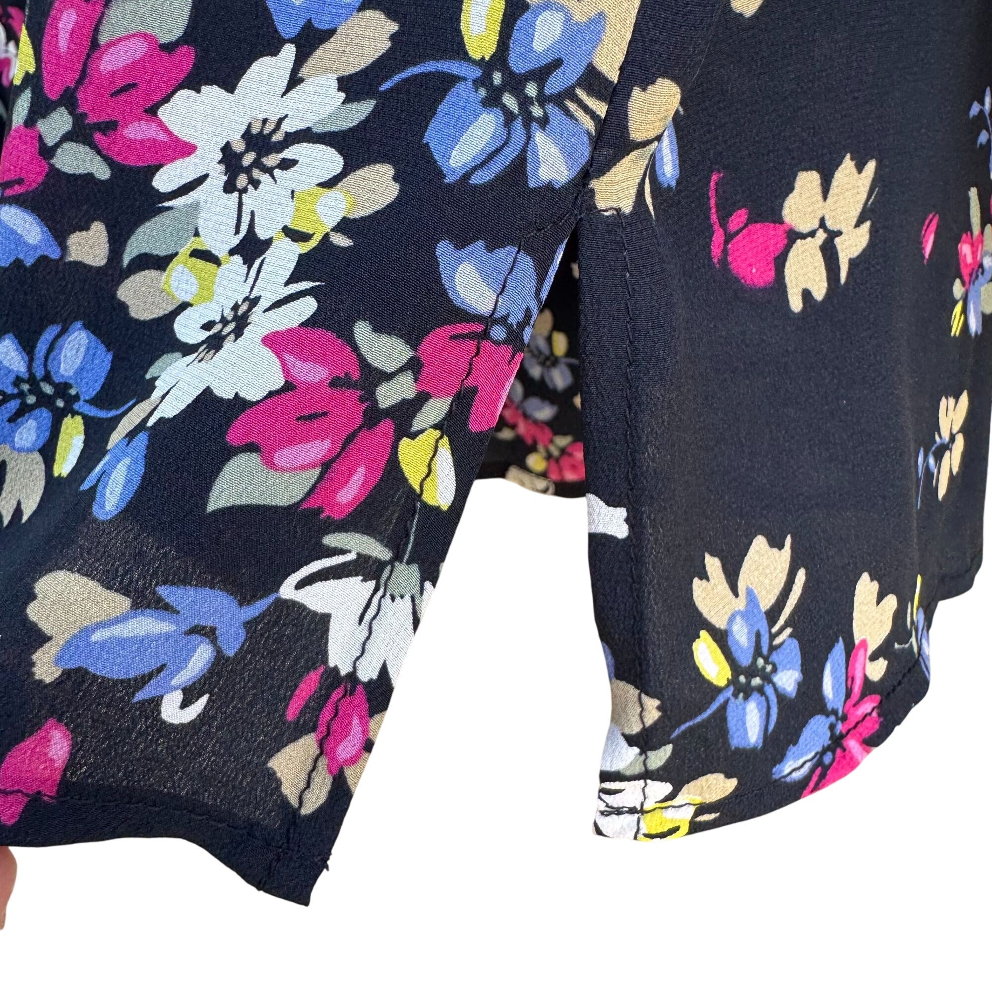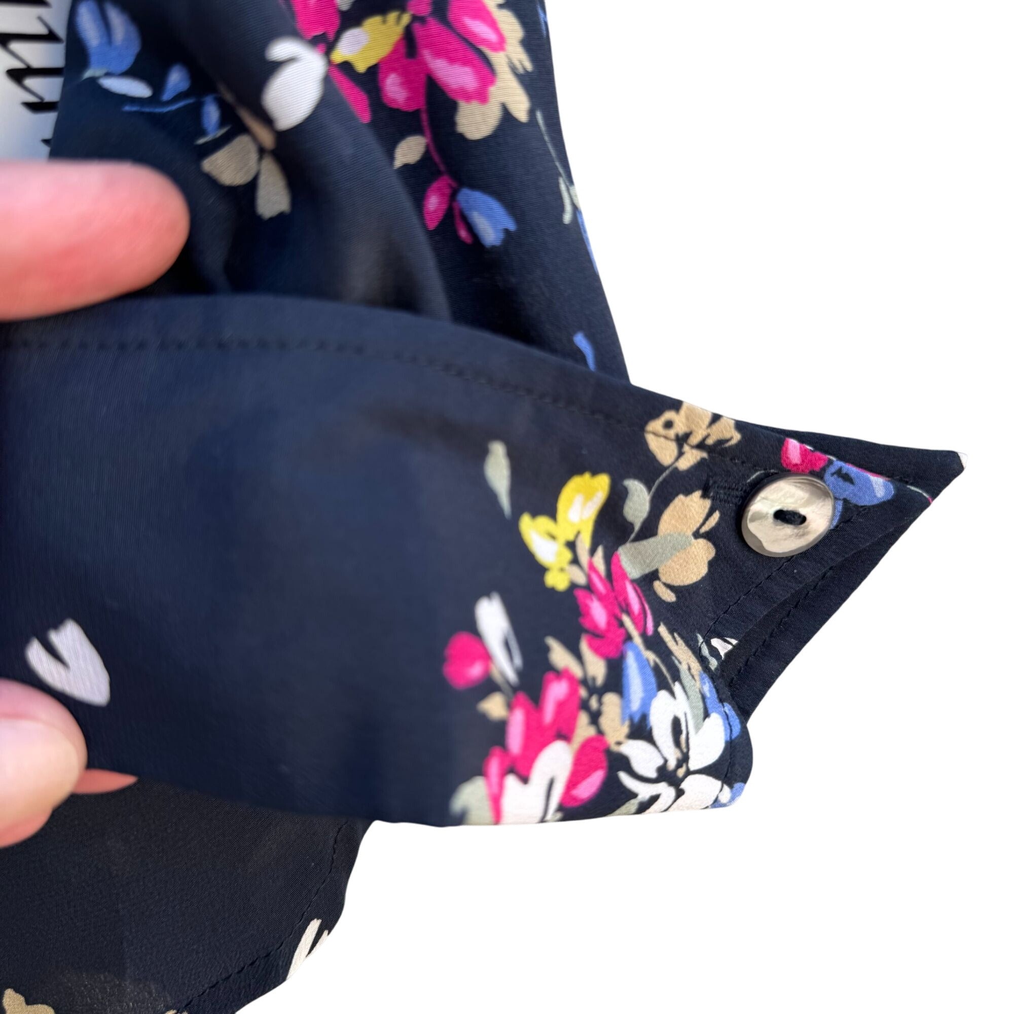 This 100% silk blouse features a classic button-up design with a navy base and vibrant floral pattern. The lightweight material ensures comfort and elegance for professional or casual settings.