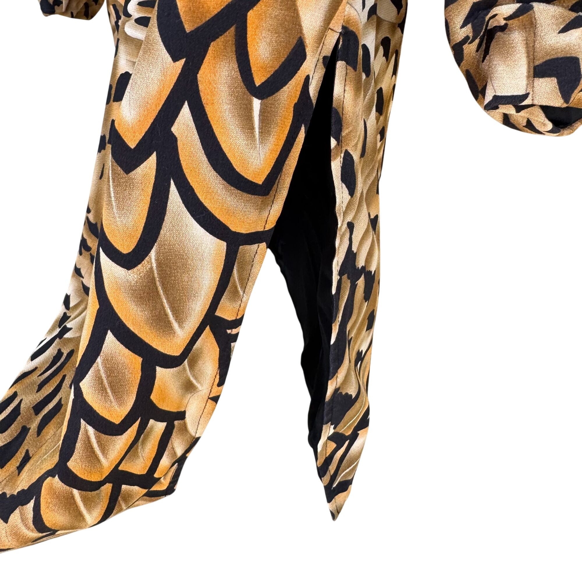 A whimsical silk blazer that transforms your wardrobe from mundane to magnificent, like a sartorial phoenix rising from the closet of conformity. This Diane Gilman piece whispers sophisticated rebellion through its mesmerizing golden and black feathered pattern.