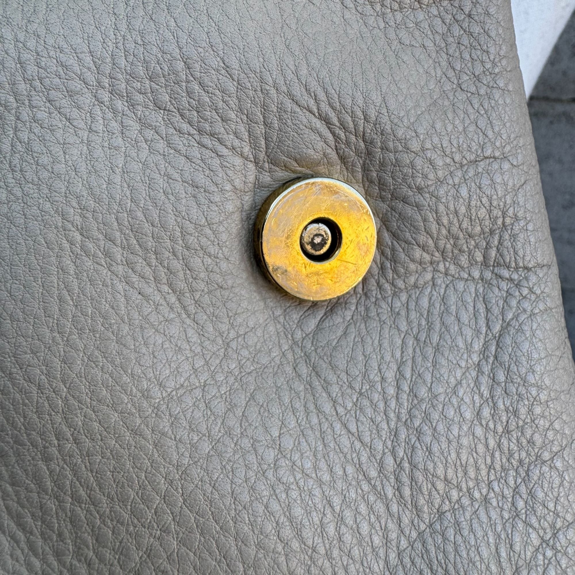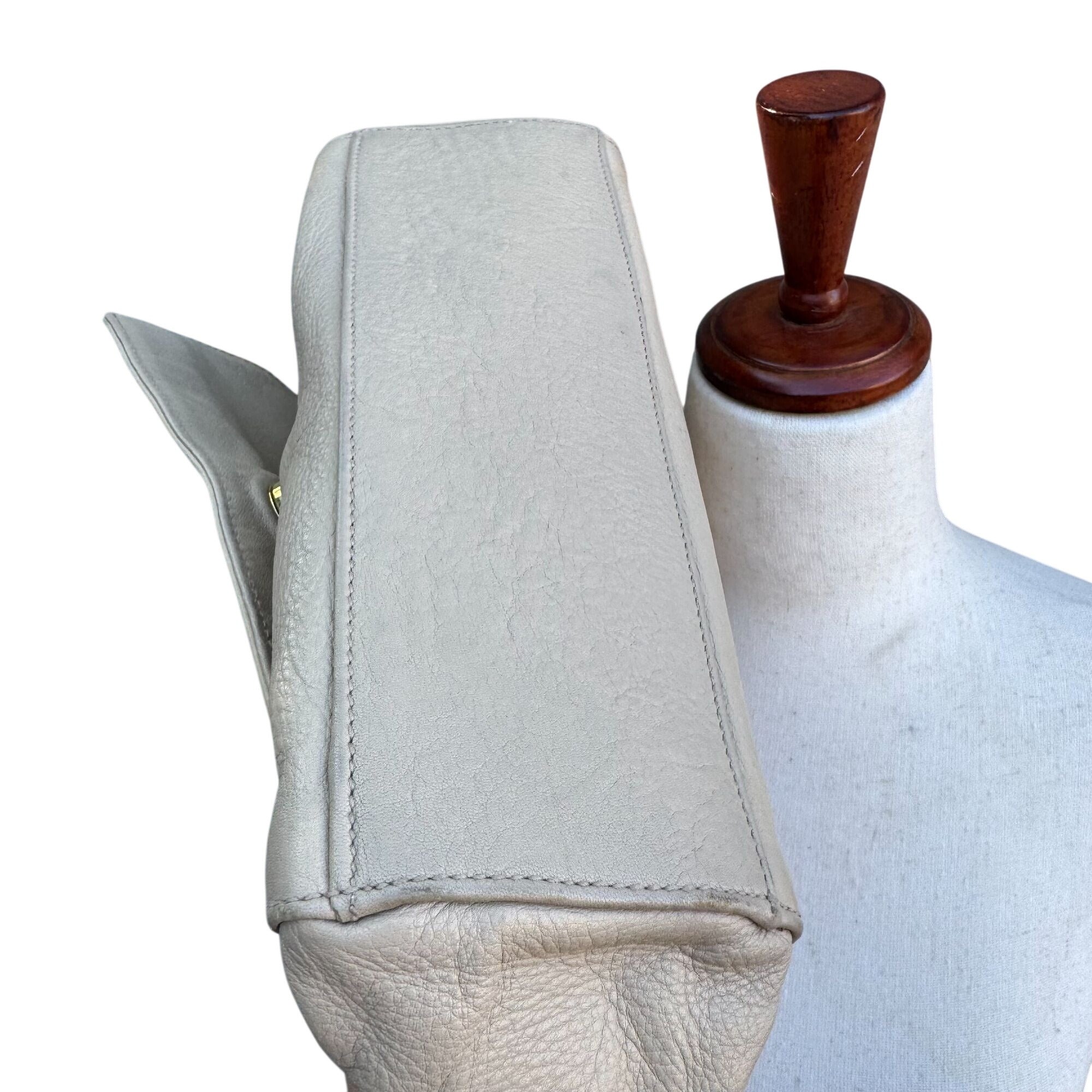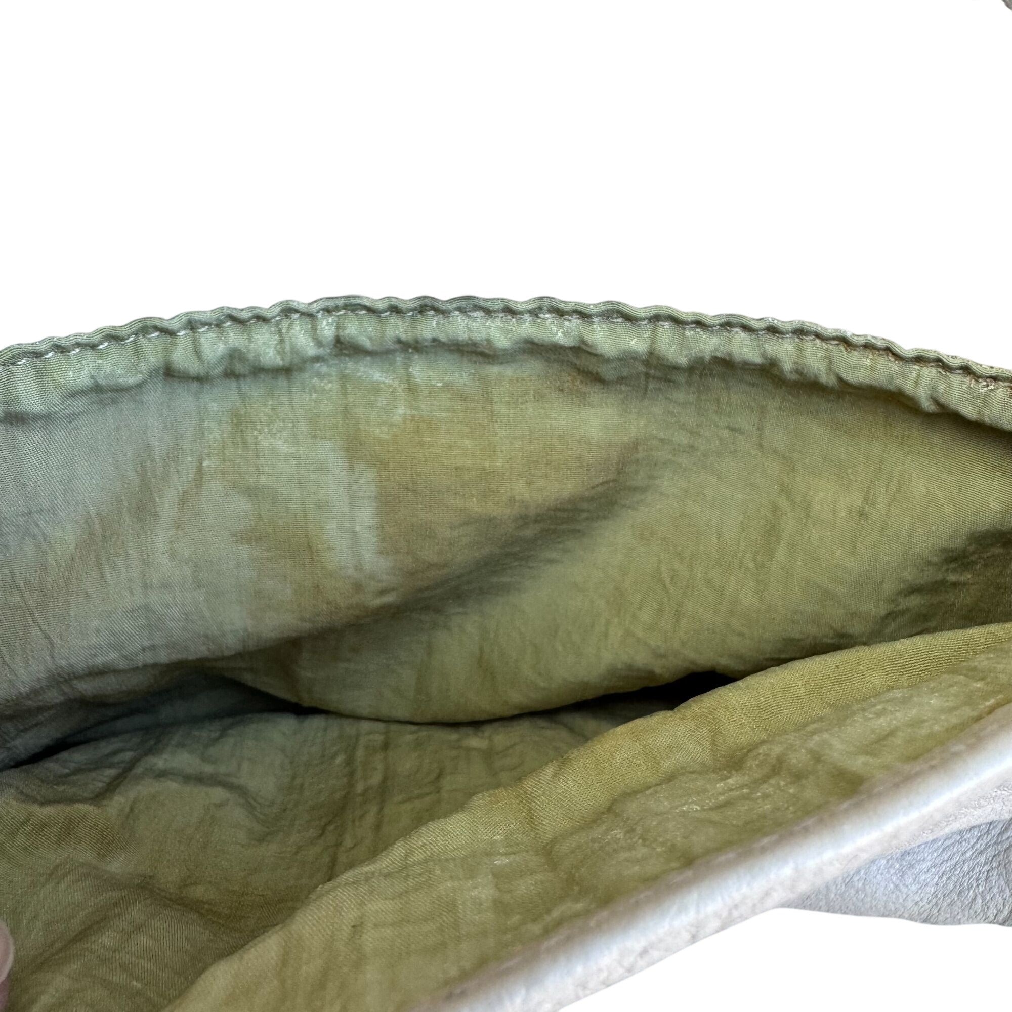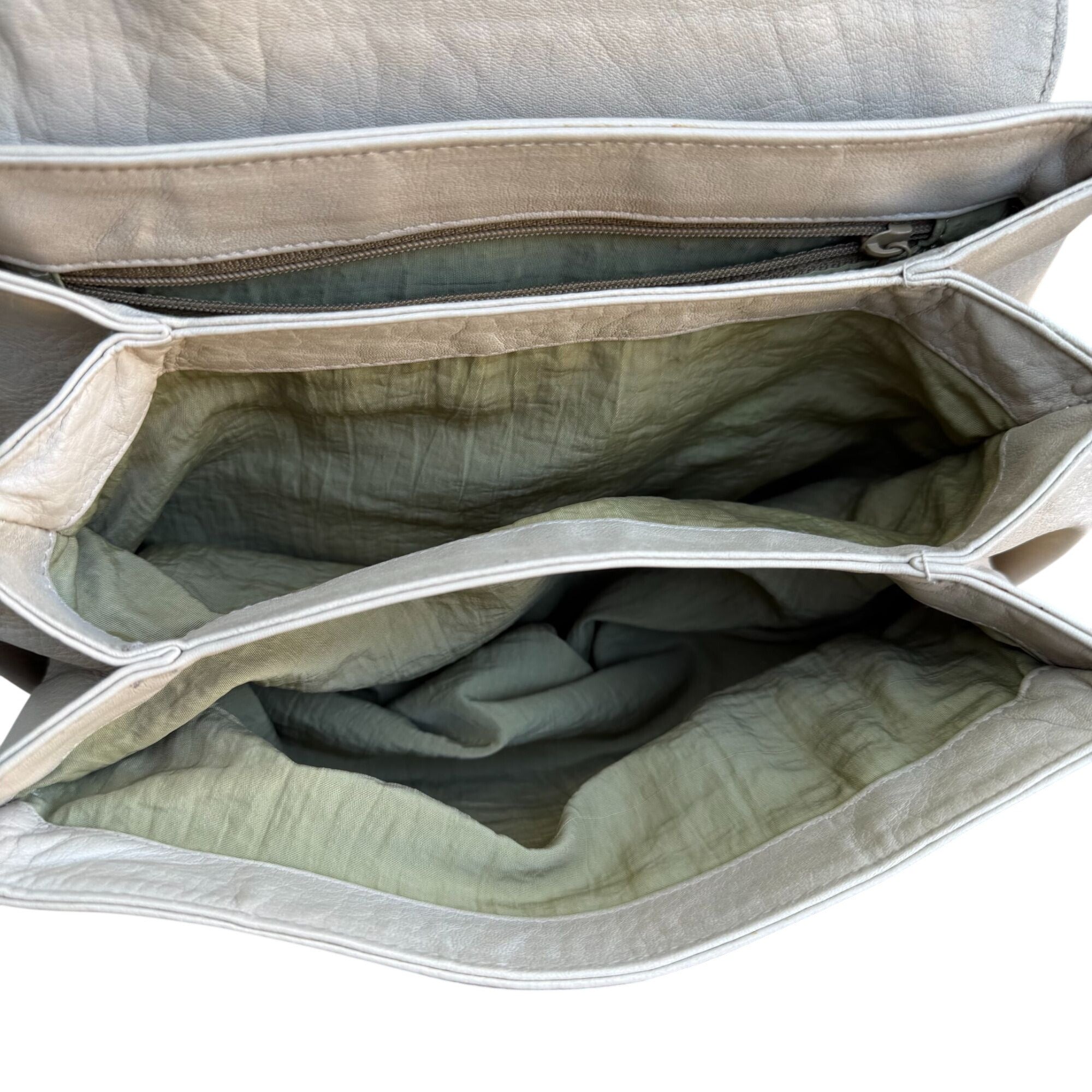 Magnetic closure shows some tarnishing, interior lining shows color fading. Top to bottom = 9 inches, Width = 9 inches, Depth = 3 inches. Strap drop 20 inches - adjustable.