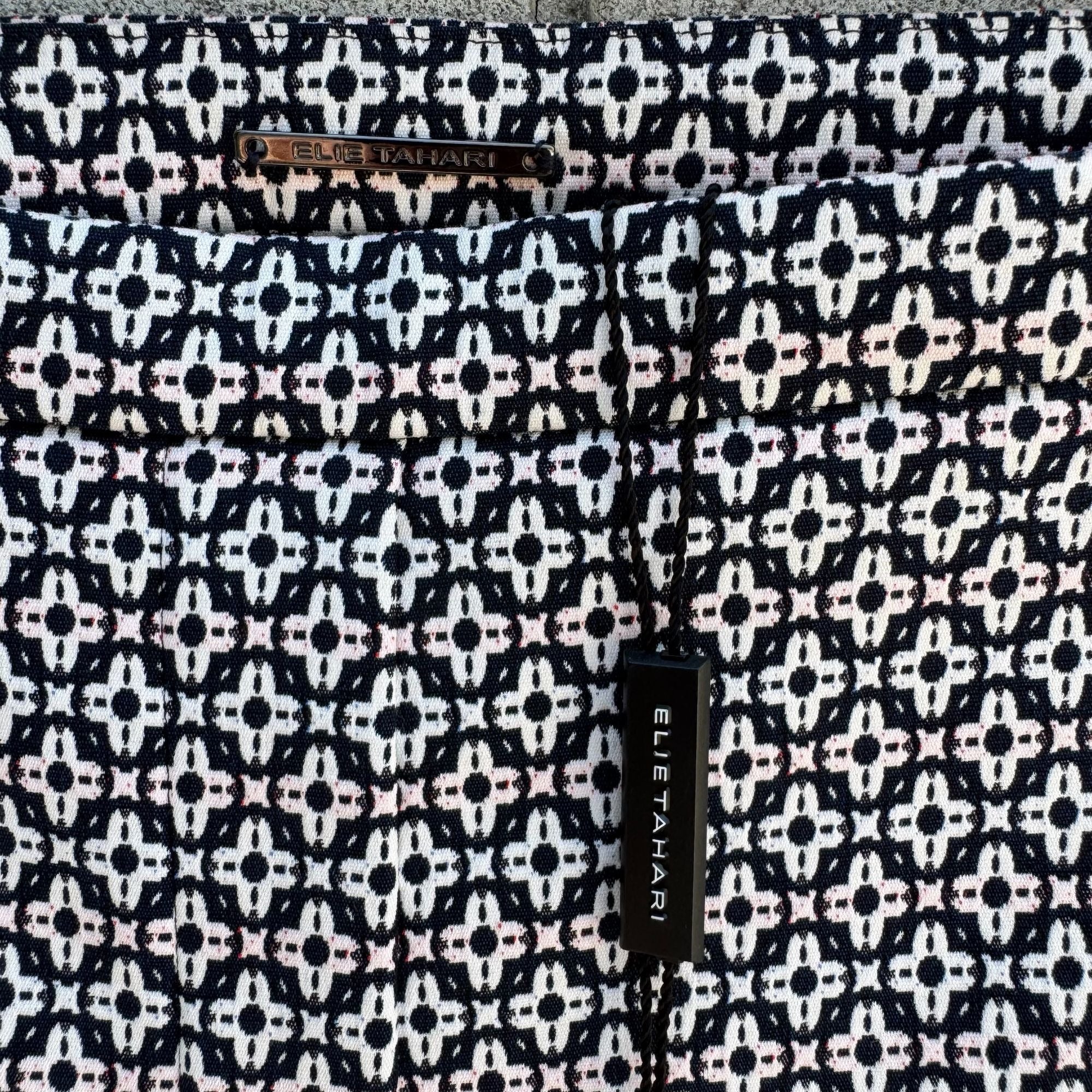 These slim-fit Elie Tahari pants offer a professional aesthetic with their geometric print and high-quality design. Ideal for work settings or formal gatherings.