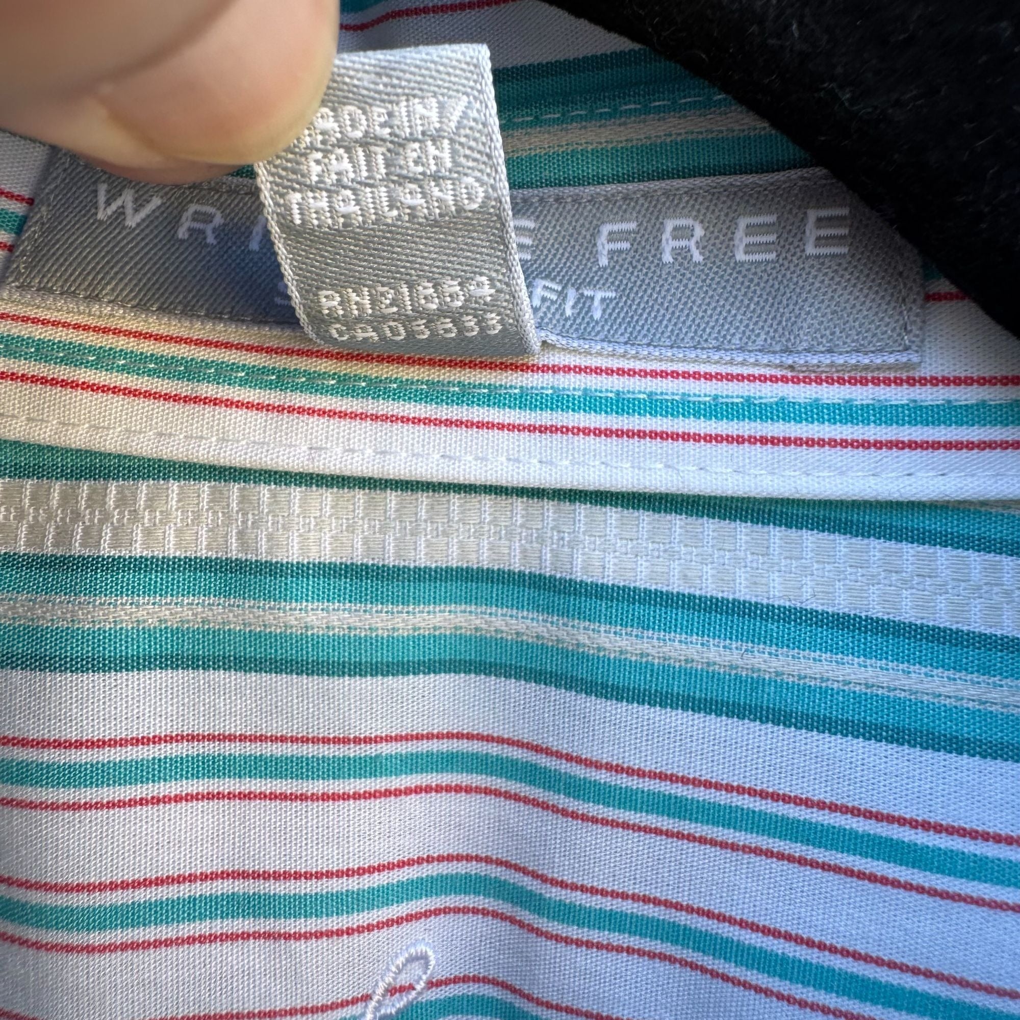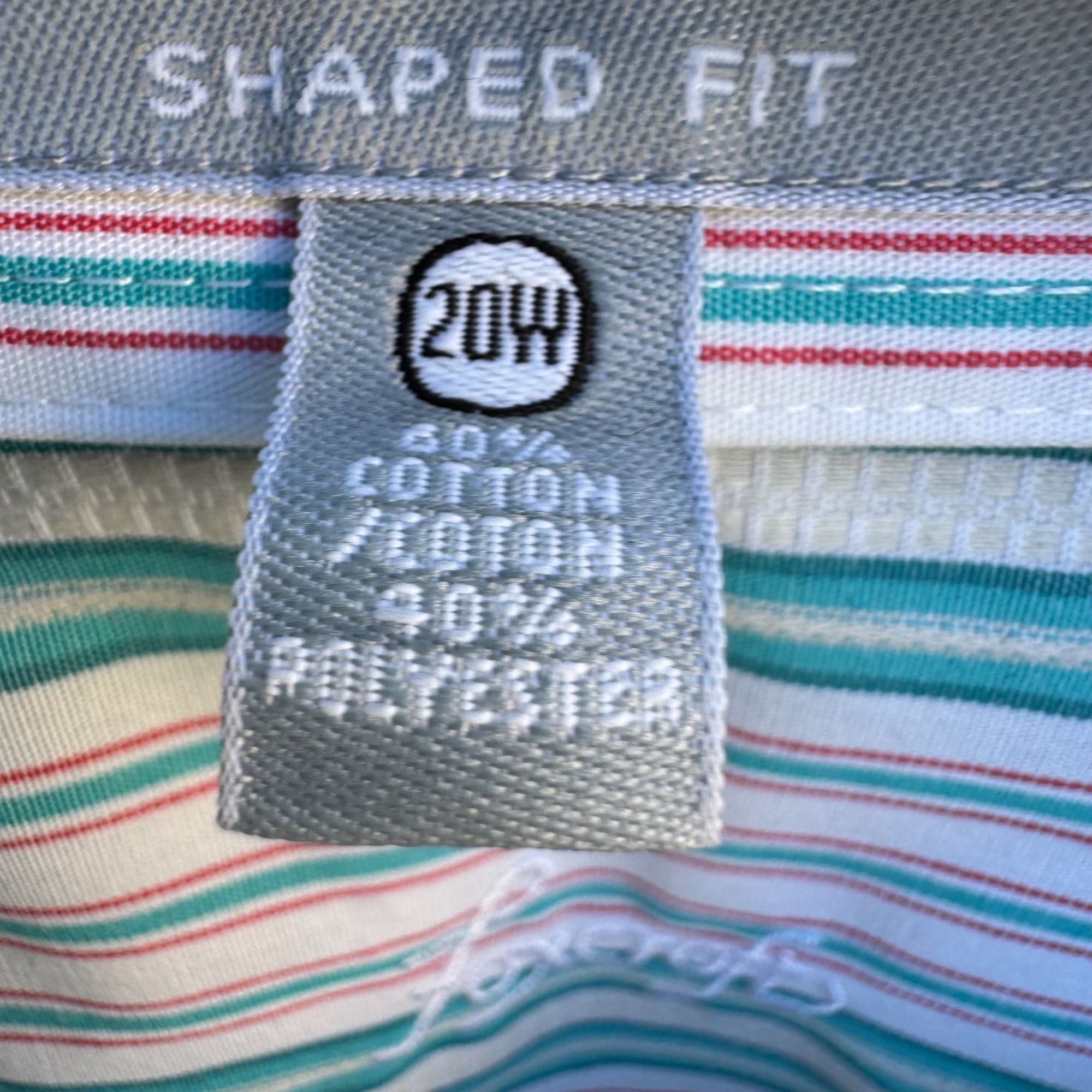 A shirt that promises to keep you looking crisp without the hassle of ironing, featuring a playful dance of turquoise, white, and coral stripes that suggest you're professional but not afraid to have a little fun.