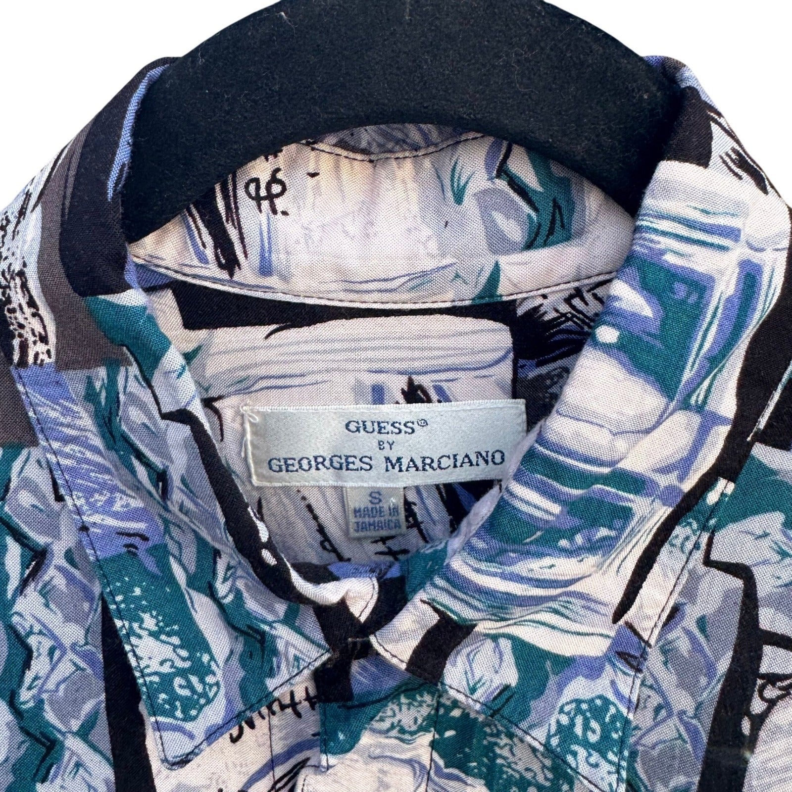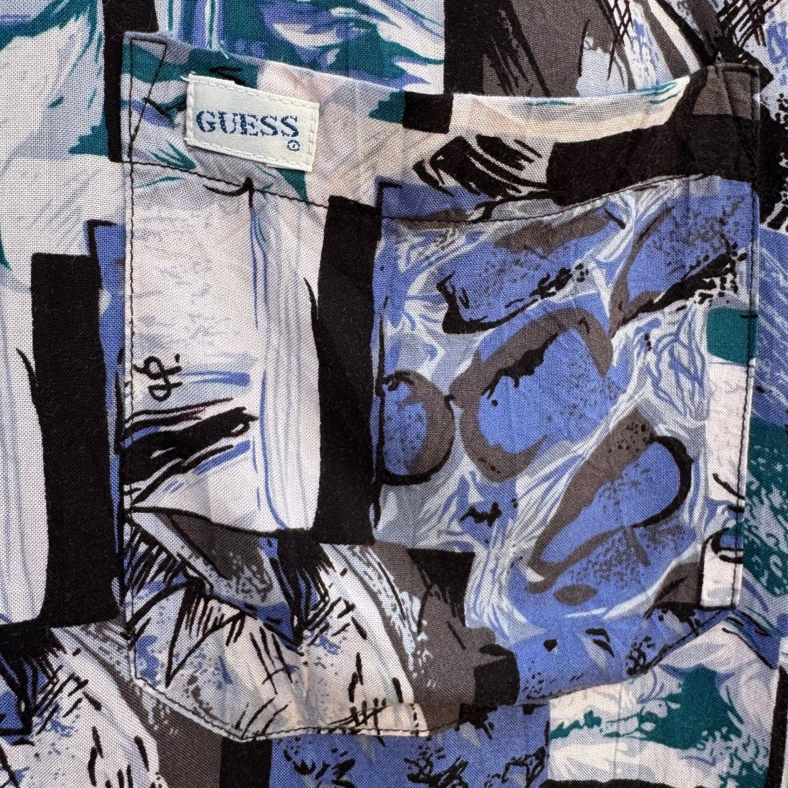 Vintage Georges Marciano for Guess button-down shirt captures a bold 90s aesthetic with its vibrant abstract geometric print. Crafted from smooth 100% rayon, this long-sleeve piece features a structured collar, a single chest pocket with a woven logo tab, and unique purple-toned branded buttons. The intricate pattern mixes shades of blue, teal, black, and white in a collage-style arrangement, making it a standout addition to any retro-inspired wardrobe.