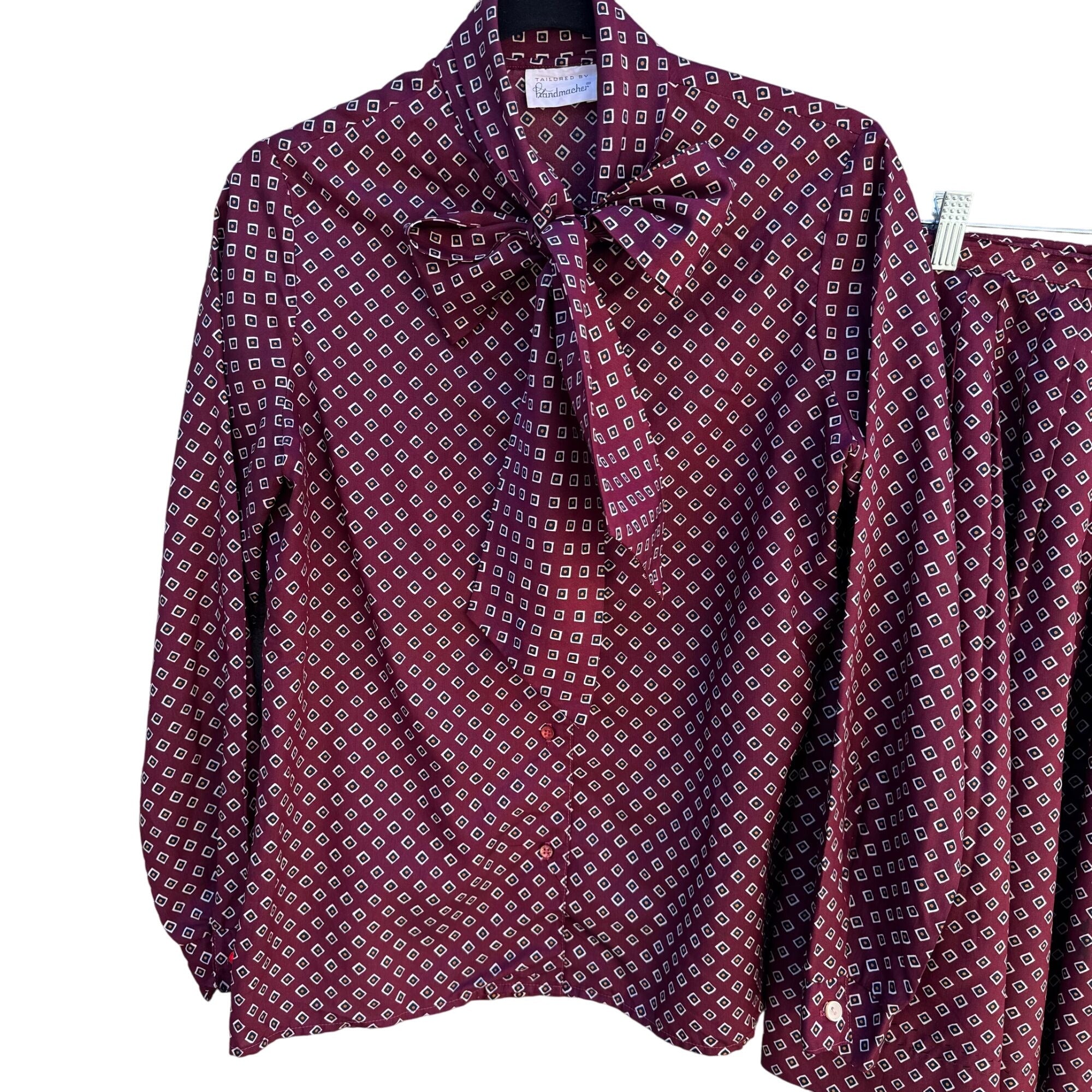 Handmacher Vintage 80s Womens Burgundy Diamond Print 2 Piece Blouse Skirt Set 8