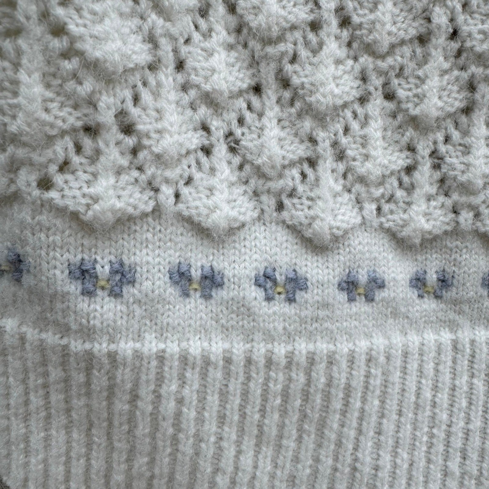 Keywords: Cottagecore, Grandma Core, Vintage 70s 80s, Pointelle Knit, Coquette, Shabby Chic, Light Academic, Feminine, Delicate, Embroidered, Made in USA, Retro Sweater, Soft Girl