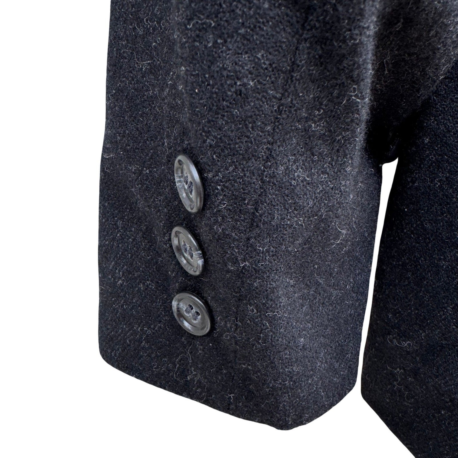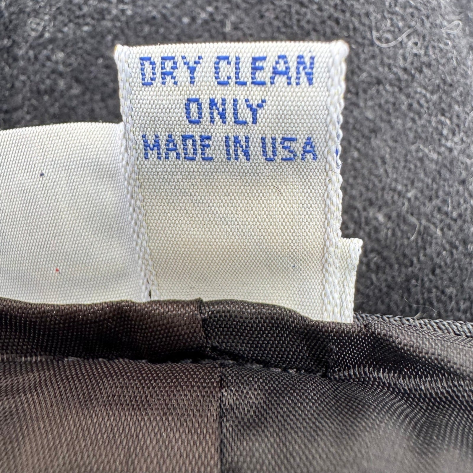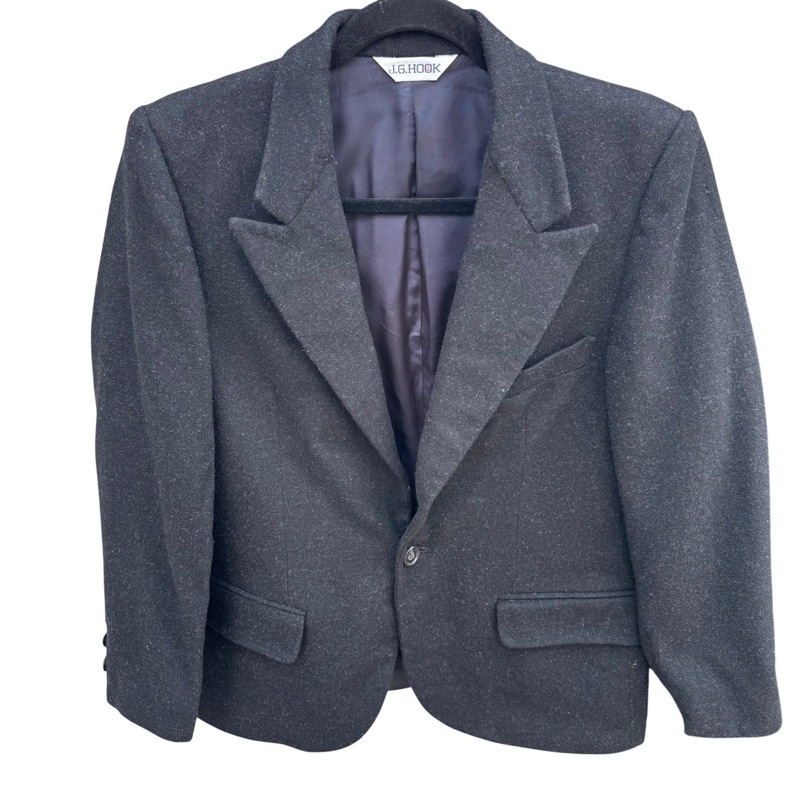 Vintage J.G. Hook skirt suit offers a timeless, sophisticated aesthetic in a deep charcoal grey black wool-like fabric. The blazer features a classic single-button closure, notched lapels, and functional pockets, while the matching pencil skirt provides a streamlined silhouette with a back vent. Expertly tailored, this set captures an 80s or 90s power-dressing vibe. Small area of lost/missing fabric under collar.
