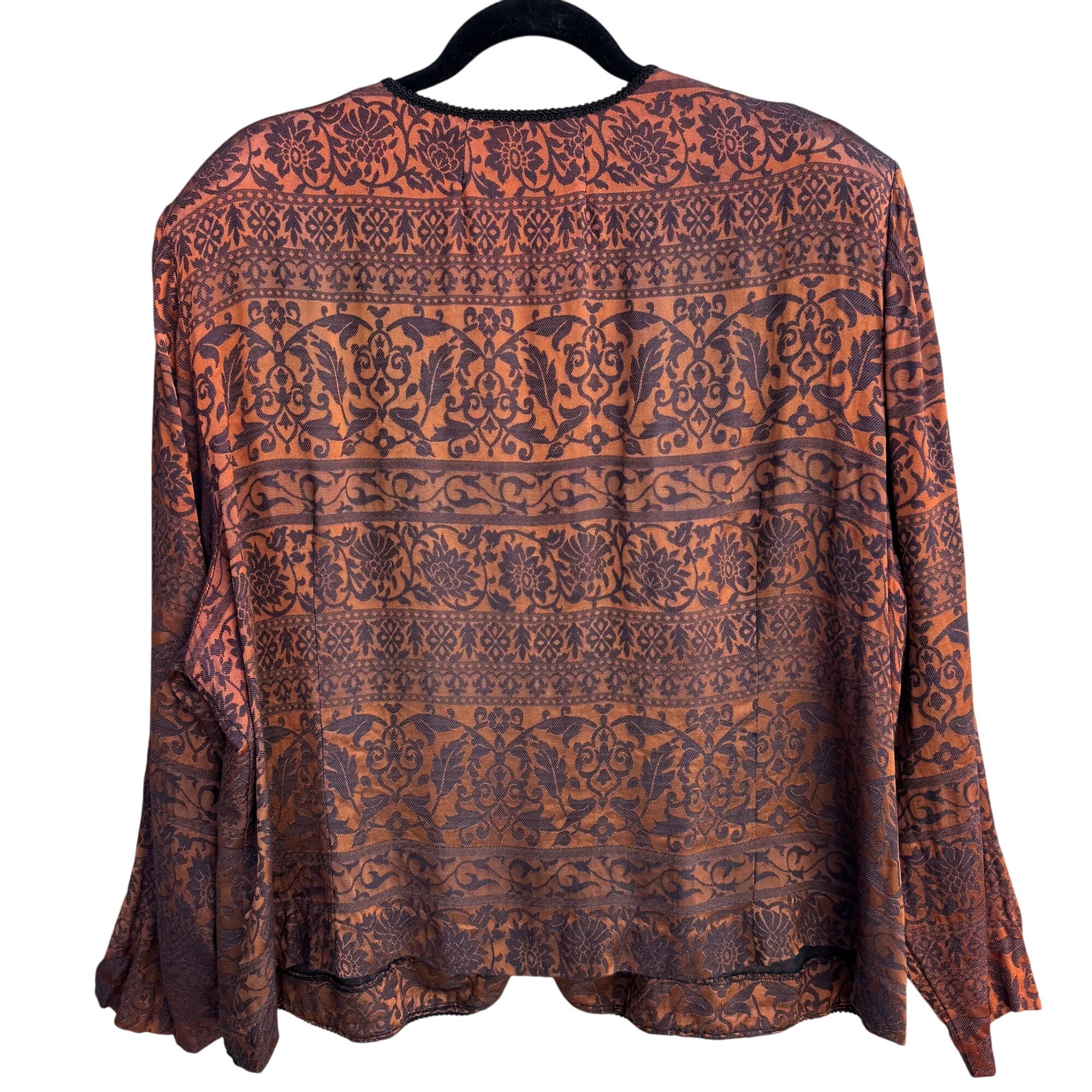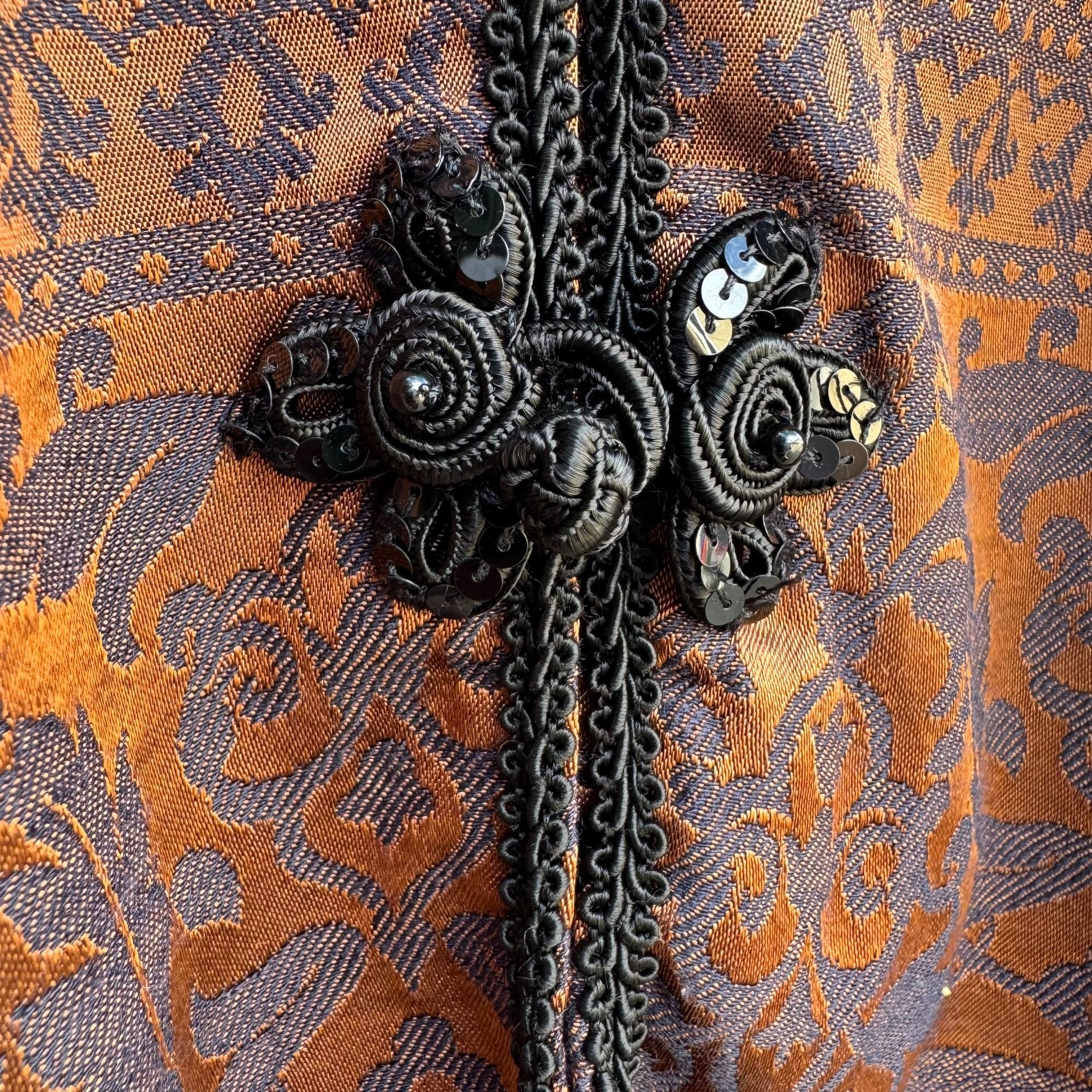 Step into elegance with this vintage jacket that whispers sophistication while also whispering, "Let's grab a latte." With its brocade pattern and ornate closures, it's both a statement piece and a conversation starter. Wear it when you want to look like you have your life together, or at least your outfit.