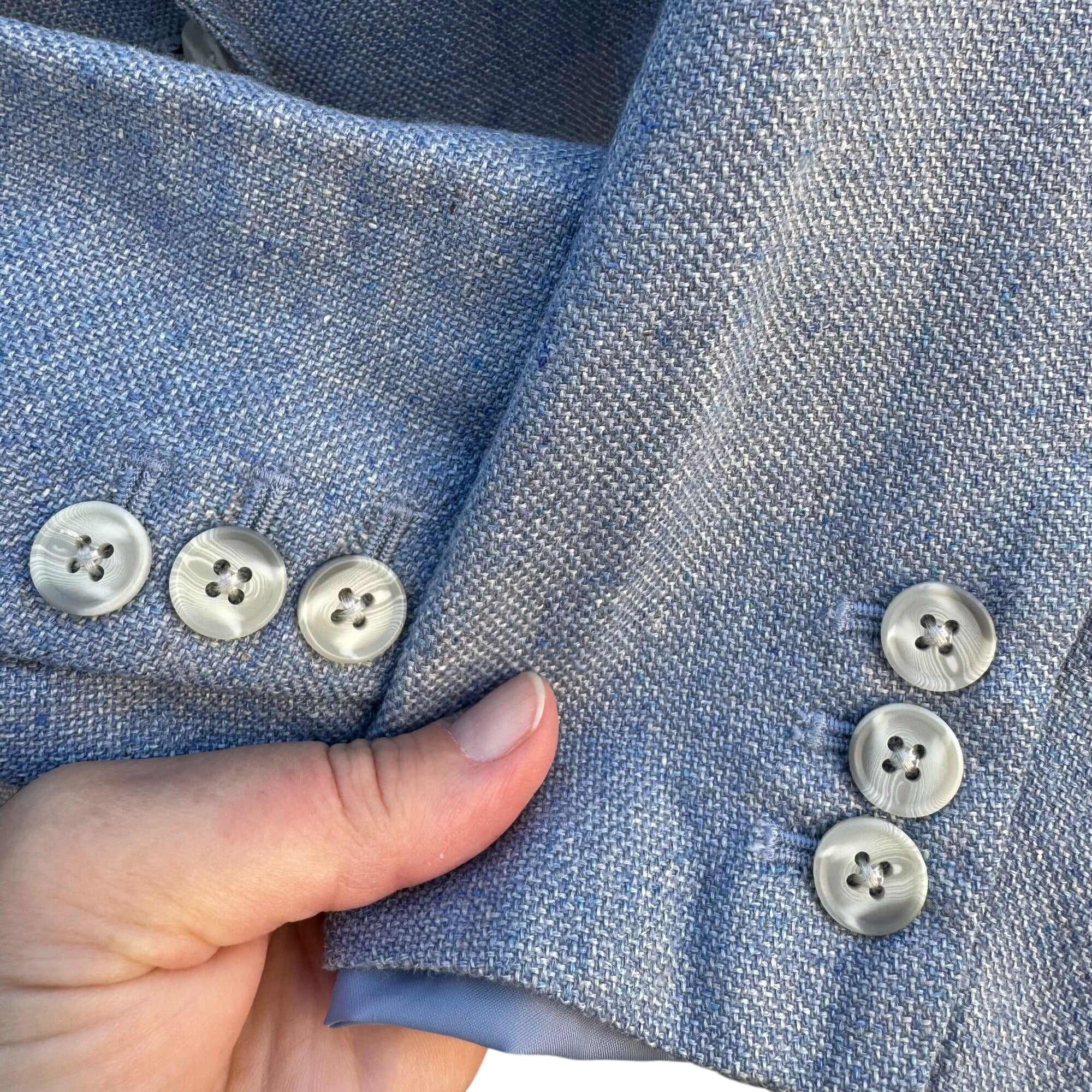 A sophisticated yet playful blue blazer that whispers "I'm professional" while secretly thinking about telling dad jokes during the board meeting. This Lands End marvel combines wool, silk, and linen into a texture that's smoother than your best workplace one-liner.
