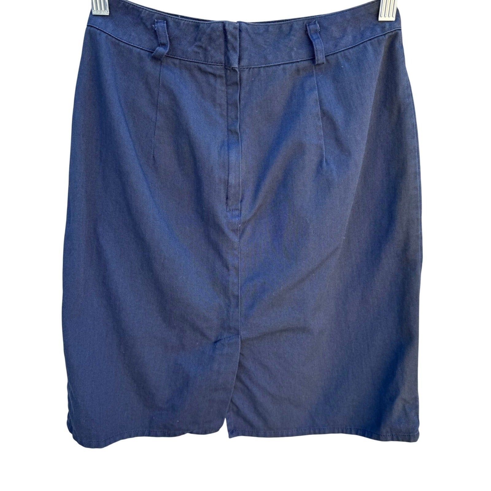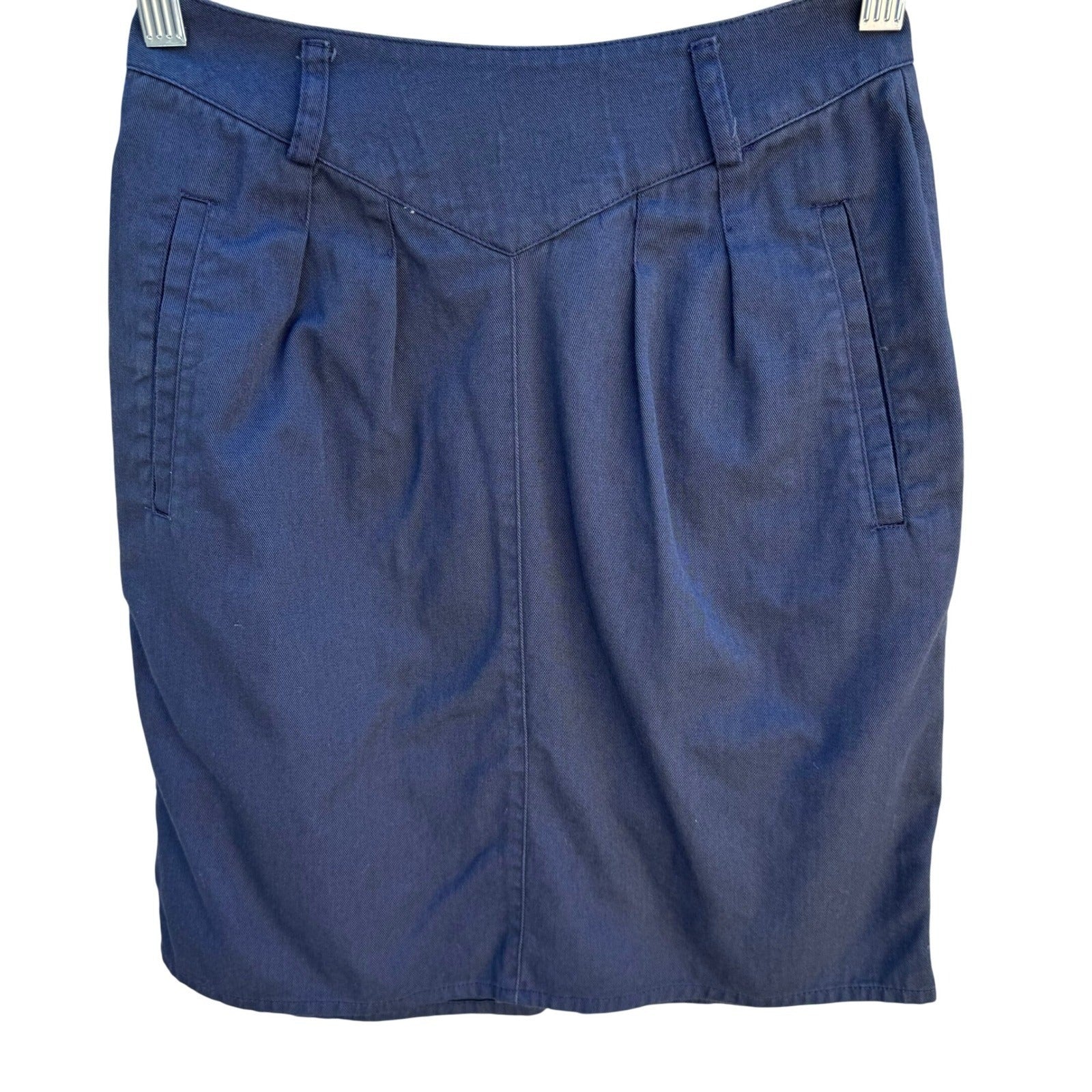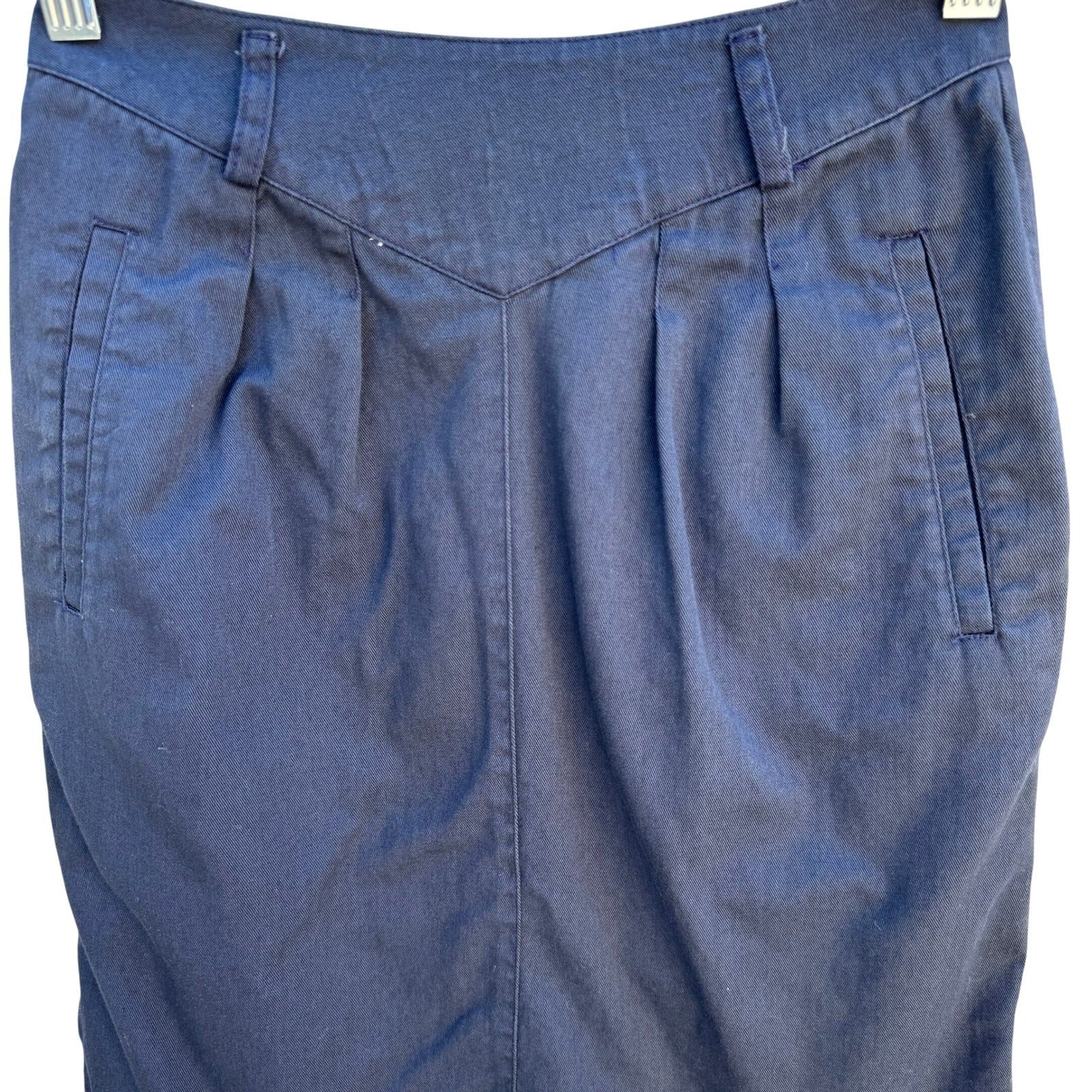 Vintage LizSport Petites navy blue pencil skirt features a unique V-yoke front with pleated detailing and side welt pockets. Crafted from a durable cotton twill, this high-waisted silhouette includes belt loops and a classic back slit for ease of movement. The garment is finished with a rear zip closure and carries the ILGWU union-made tag, signifying its authentic vintage American craftsmanship.