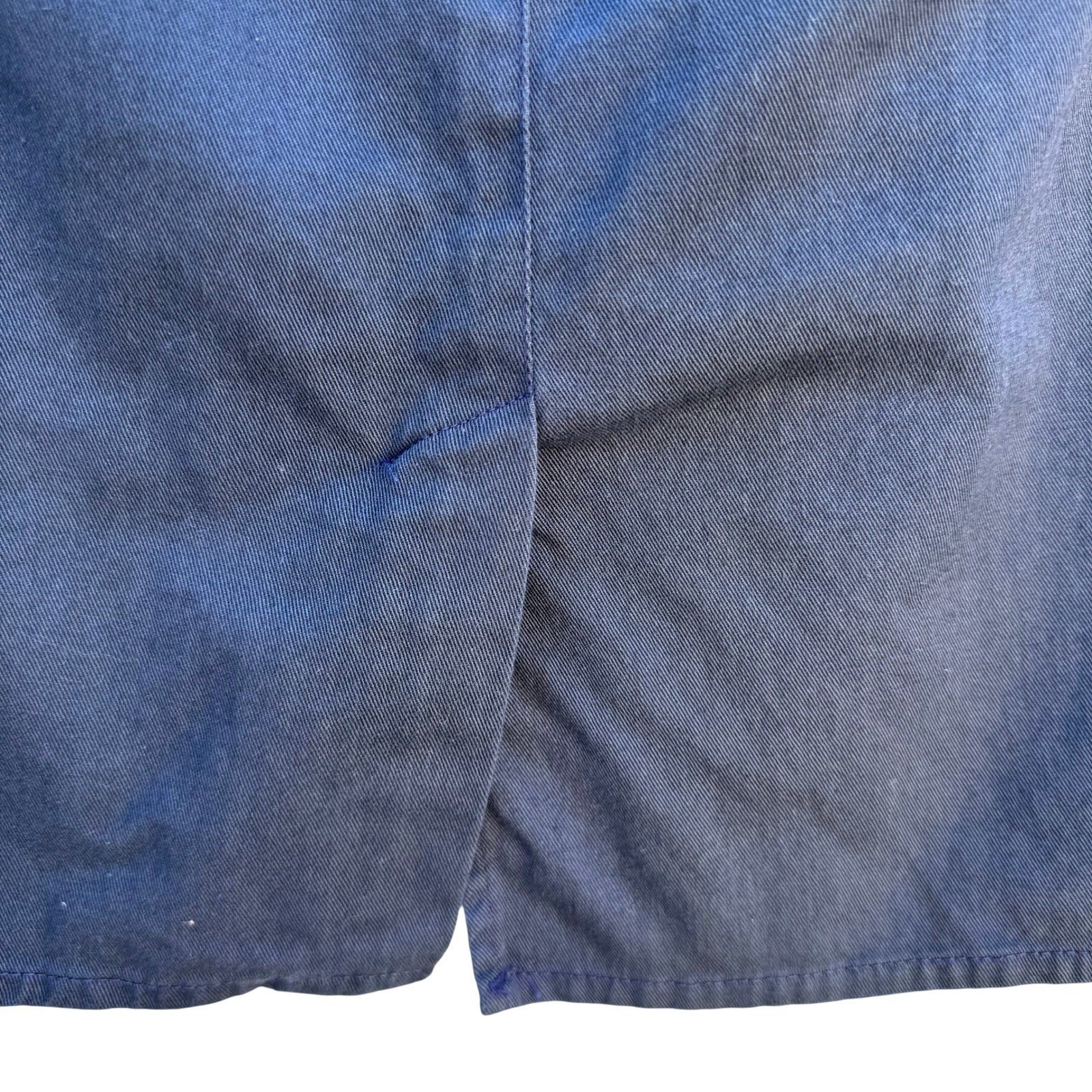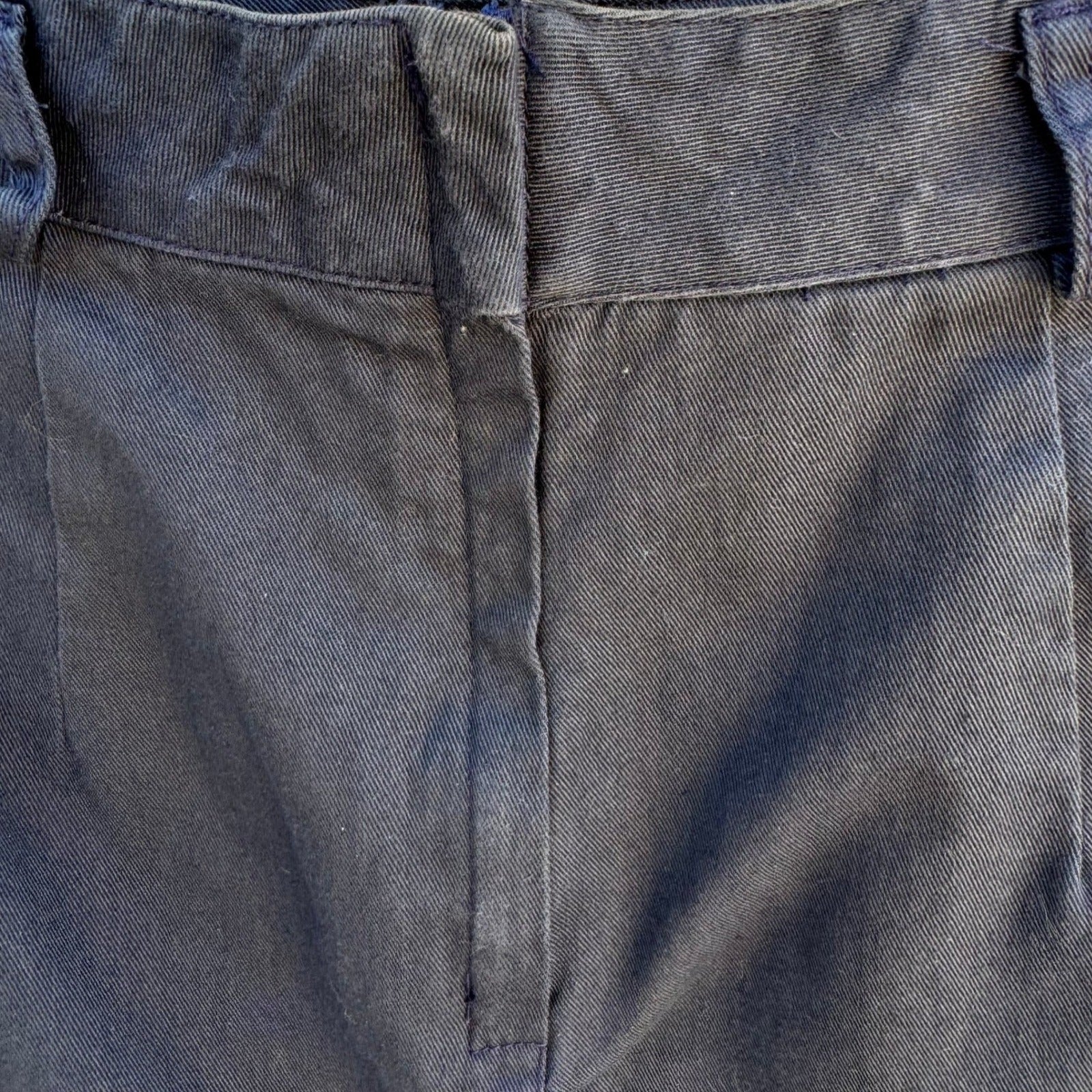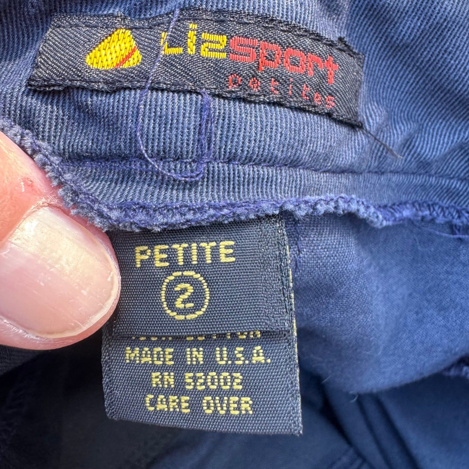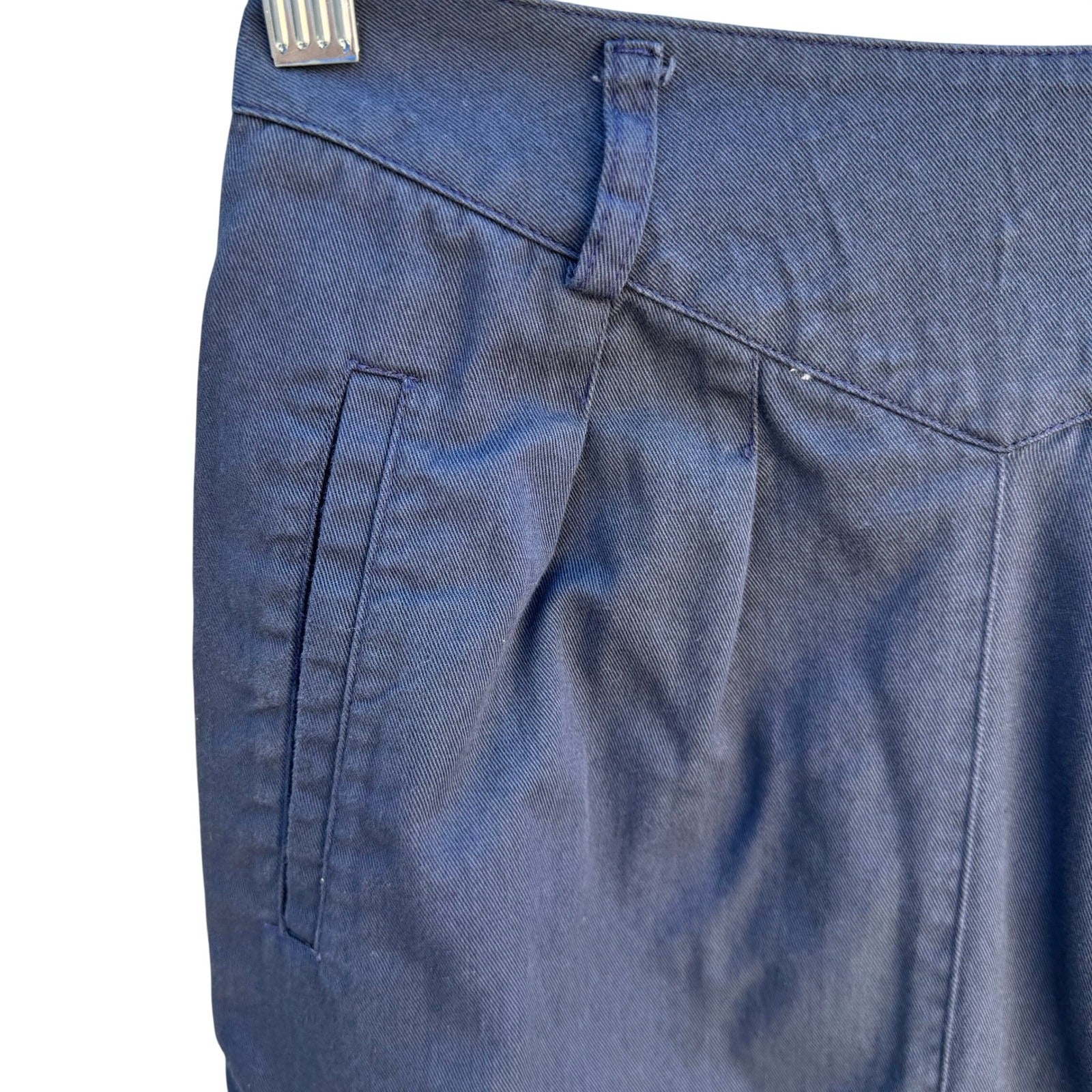 Vintage LizSport Petites navy blue pencil skirt features a unique V-yoke front with pleated detailing and side welt pockets. Crafted from a durable cotton twill, this high-waisted silhouette includes belt loops and a classic back slit for ease of movement. The garment is finished with a rear zip closure and carries the ILGWU union-made tag, signifying its authentic vintage American craftsmanship.