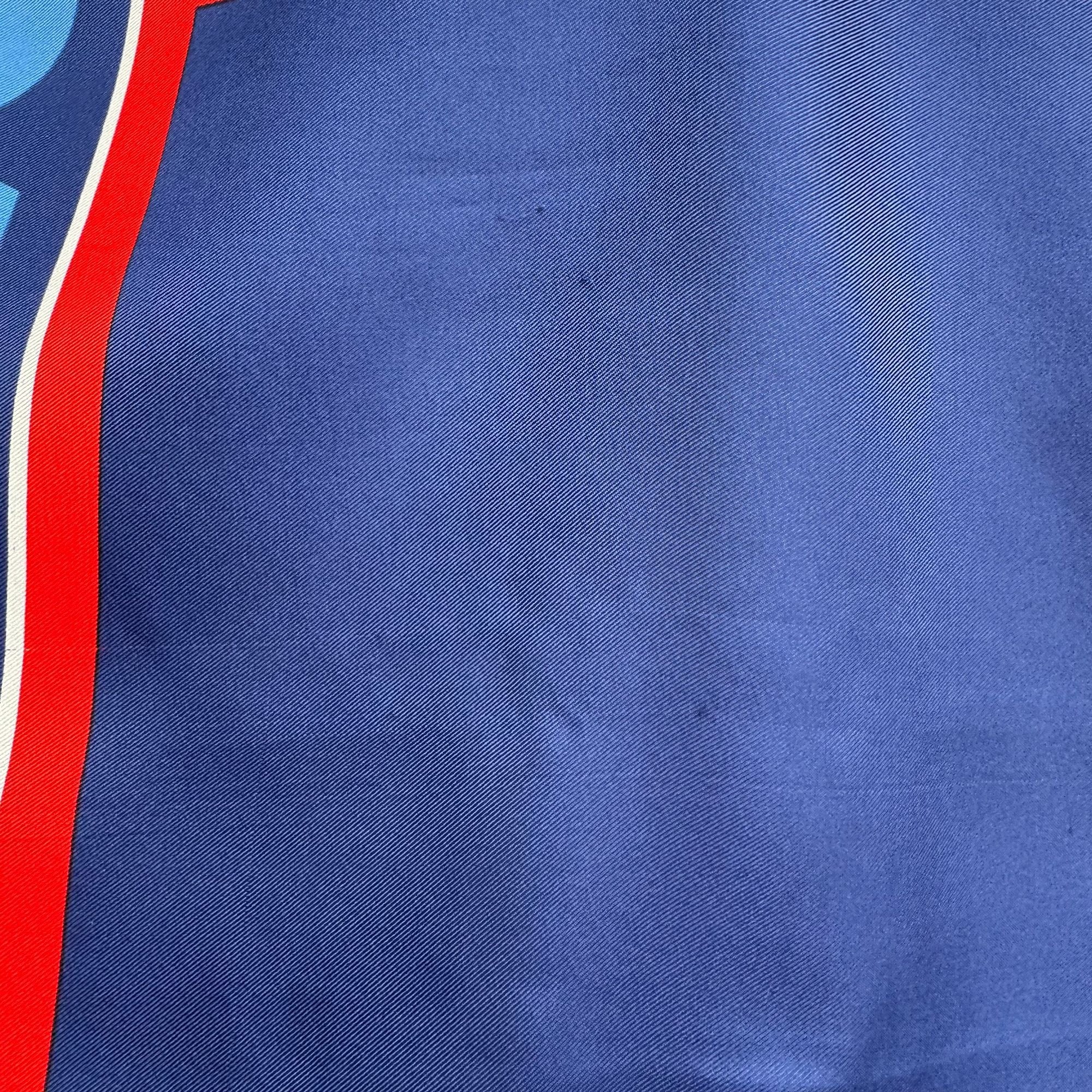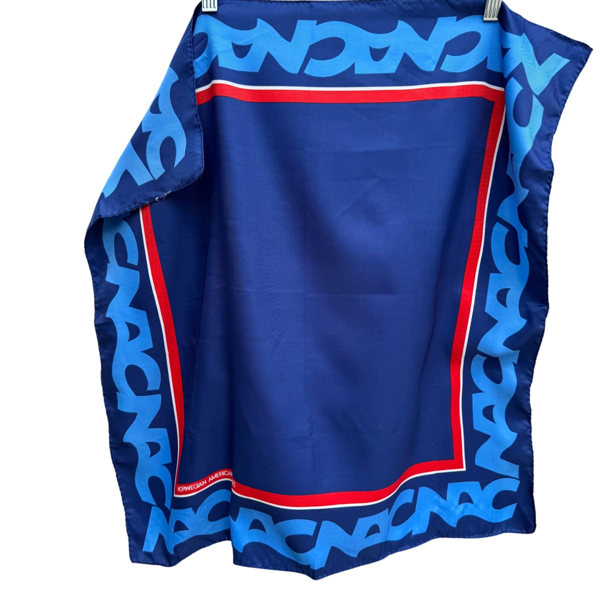 This vintage scarf from Norwegian American Cruises adds a touch of elegance with its deep blue and red design.