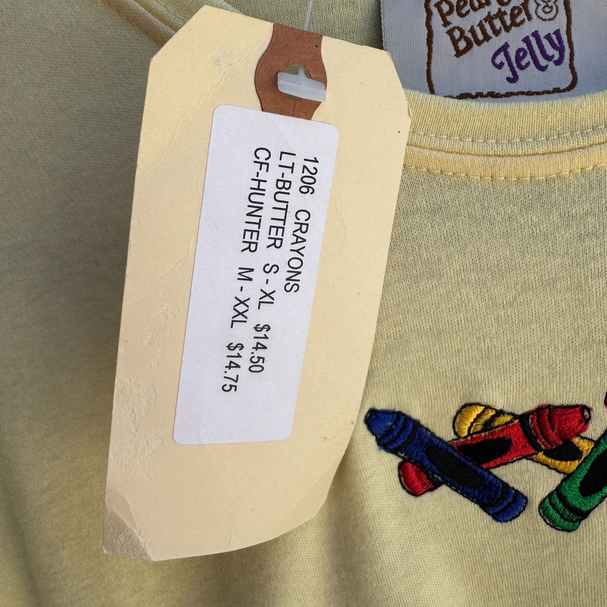 This shirt is a delightful canvas for those who enjoy a splash of humor in their wardrobe. It showcases crayons in vibrant hues, making it the perfect attire for those who color outside the lines. With a name like Peanut Butter & Jelly, it might just become your new comfort food, err, shirt.