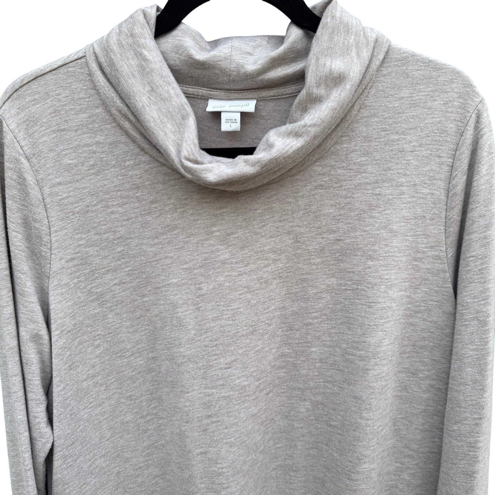 Pure Jill Luxe Tencel cowl neck tunic top provides a sophisticated yet relaxed silhouette in a soft oatmeal heather knit. This versatile piece features a draped cowl neckline, long sleeves, and practical front pockets integrated into the side seams. The premium fabric blend offers a gentle stretch and a smooth, high-quality feel, making it an ideal choice for layering or wearing as a standalone longline top.