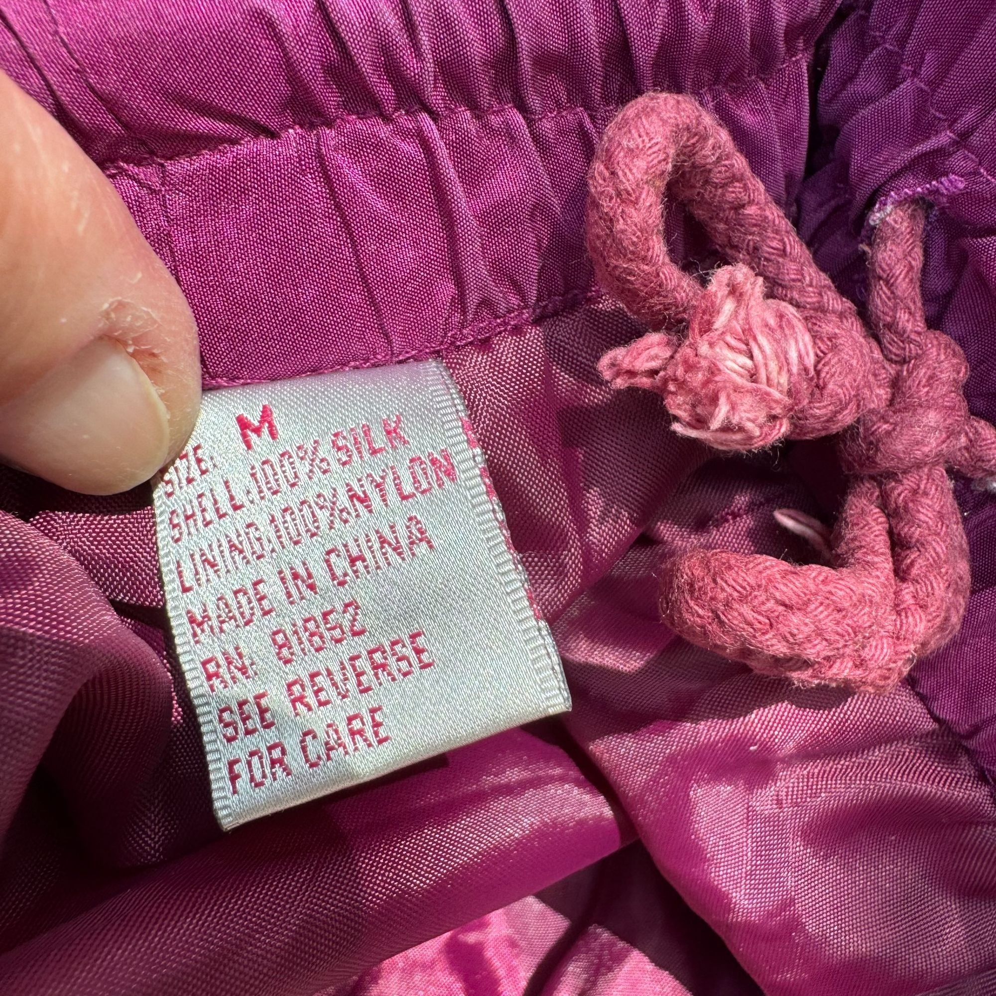 This magenta silk tracksuit combines elegance with comfort, featuring intricate embroidered gold star details and an elastic waistband for a tailored fit.
