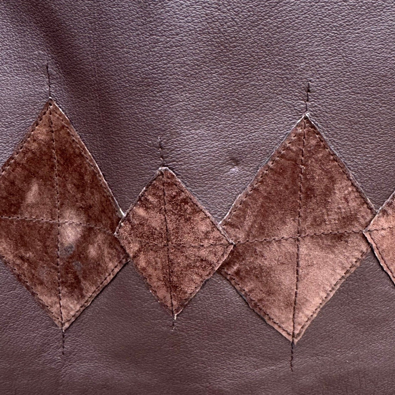 Terry Lewis Classic Luxuries brown leather midi skirt offers a sophisticated silhouette with unique artisanal details. Crafted from supple 100% leather, this piece is a rich chocolate brown complemented by a decorative diamond-patterned suede patchwork trim along the hem. The design includes a comfortable elasticized waistband at the back for, a smooth flat front with darting for structure, and a side zipper closure.