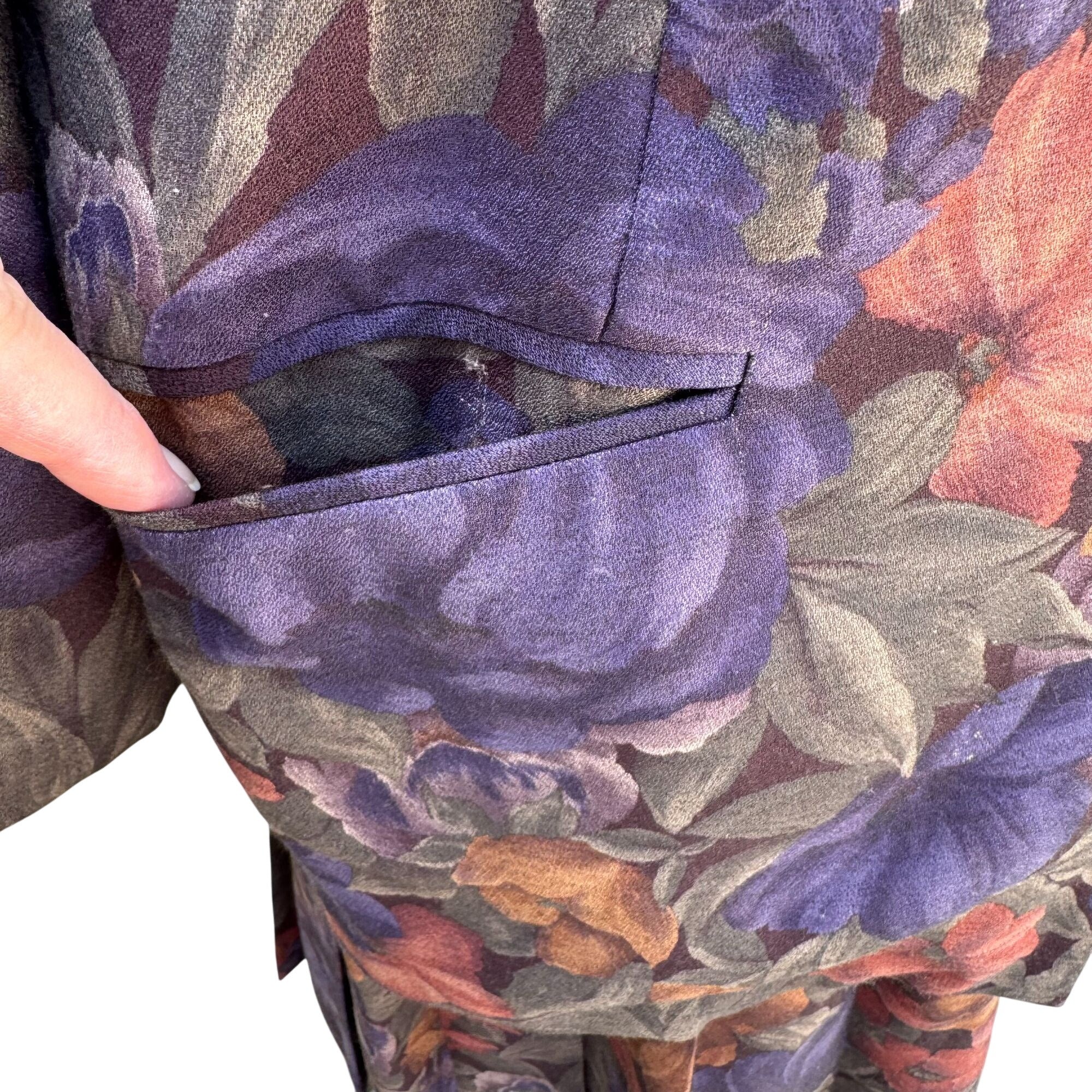 A sophisticated vintage blazer showcasing a rich floral pattern in vibrant hues. Features a button-front design, pleated hem, and long sleeves for an elegant look.