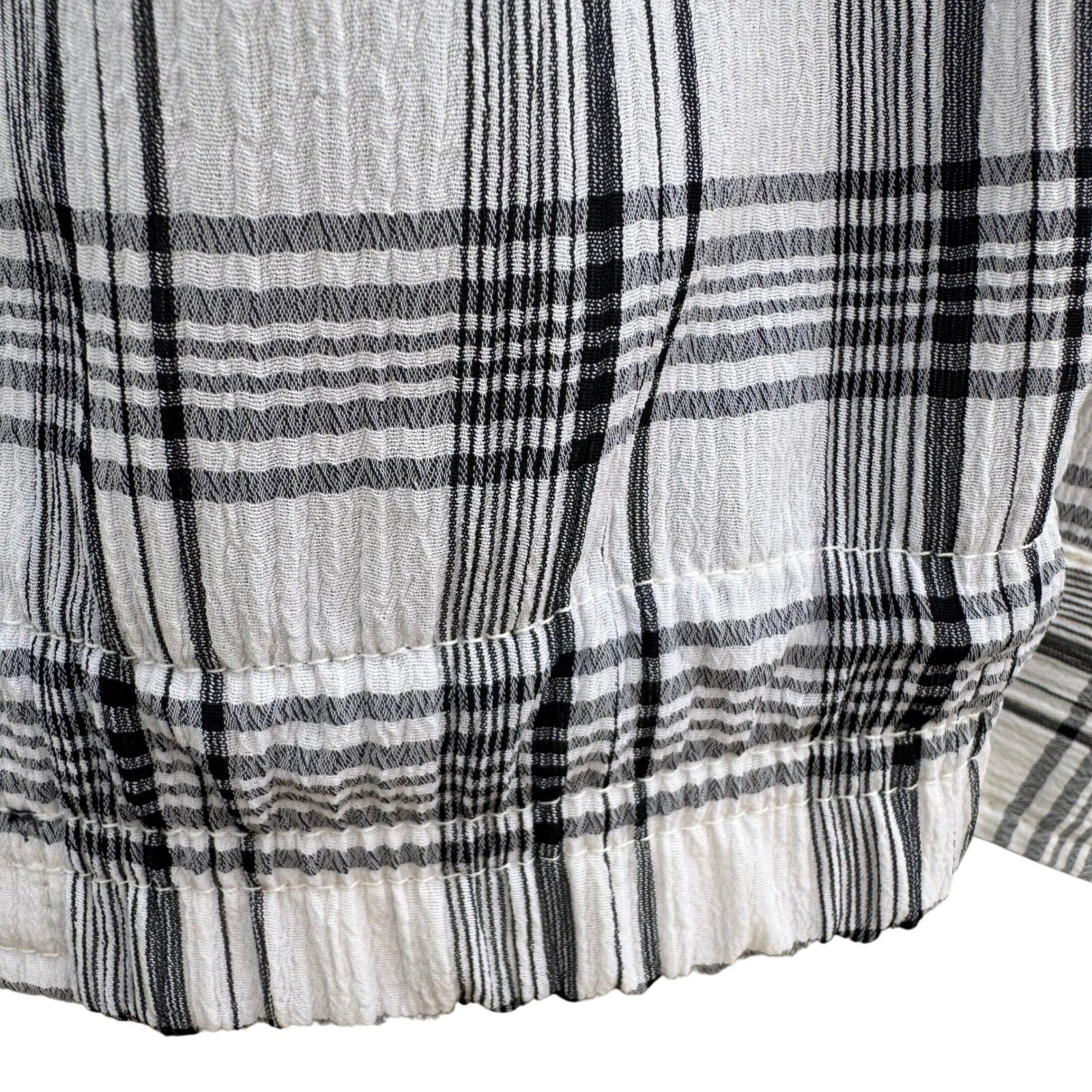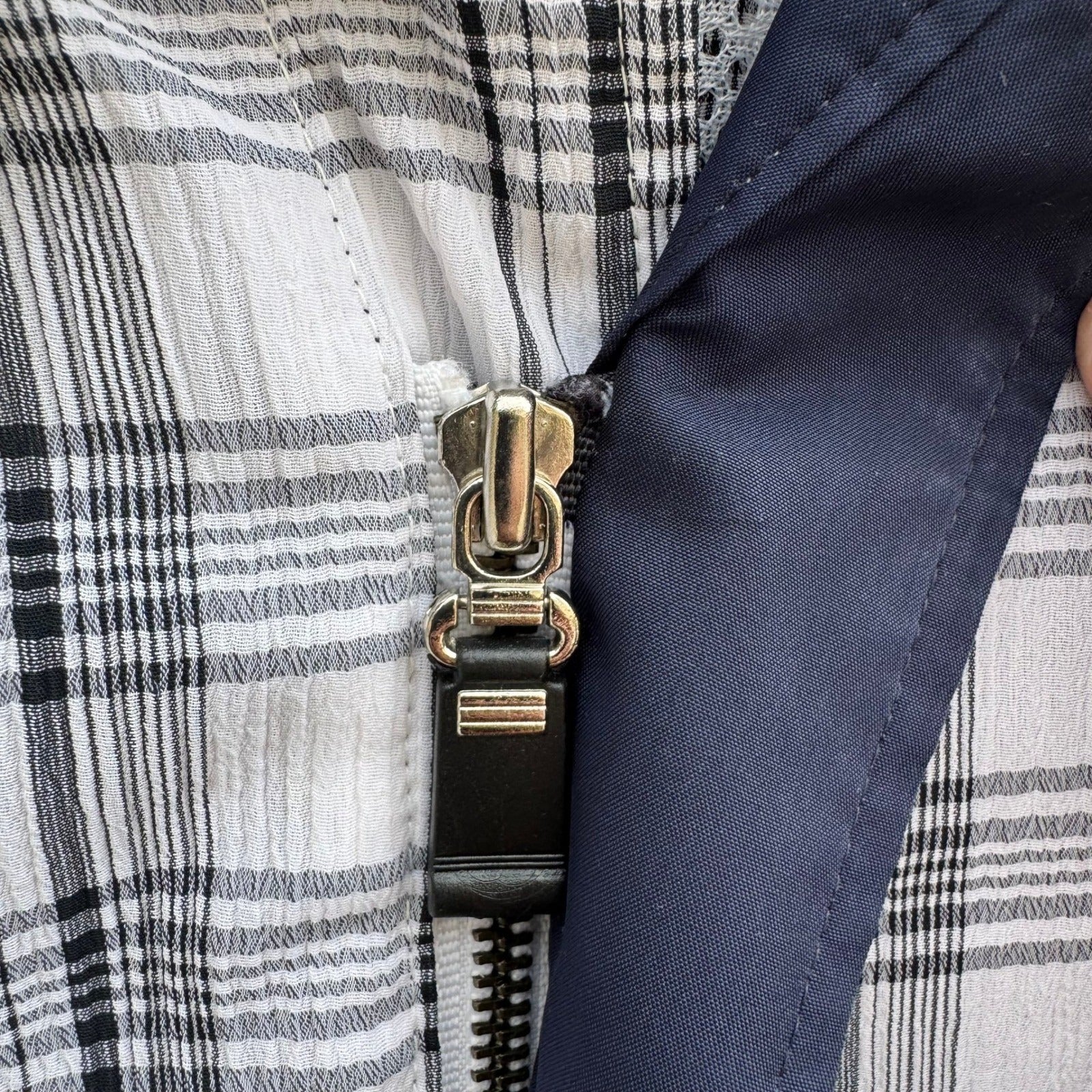 Lightweight zip-up jacket features a classic plaid pattern in white, black, and grey with a contrasting navy blue collar. Constructed from a textured seersucker-like fabric, it offers a breathable feel enhanced by a partial mesh interior lining. The front includes a full-length zipper with a leather-accented pull, two slanted welt pockets, and a subtle embroidered logo on the chest.