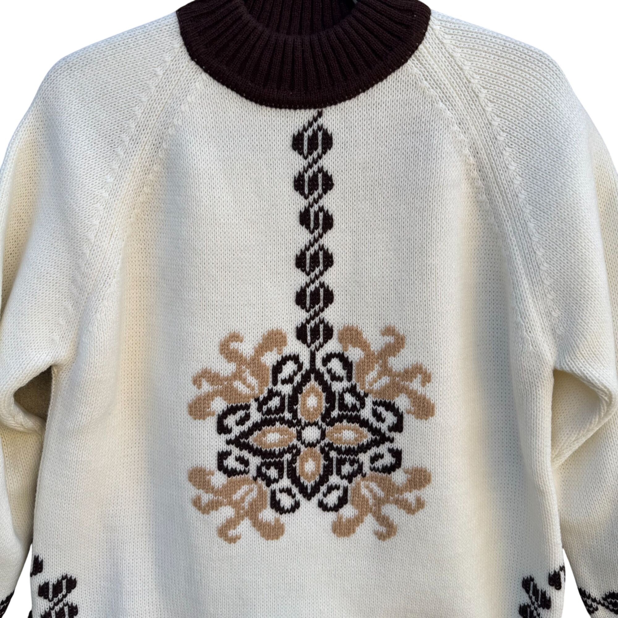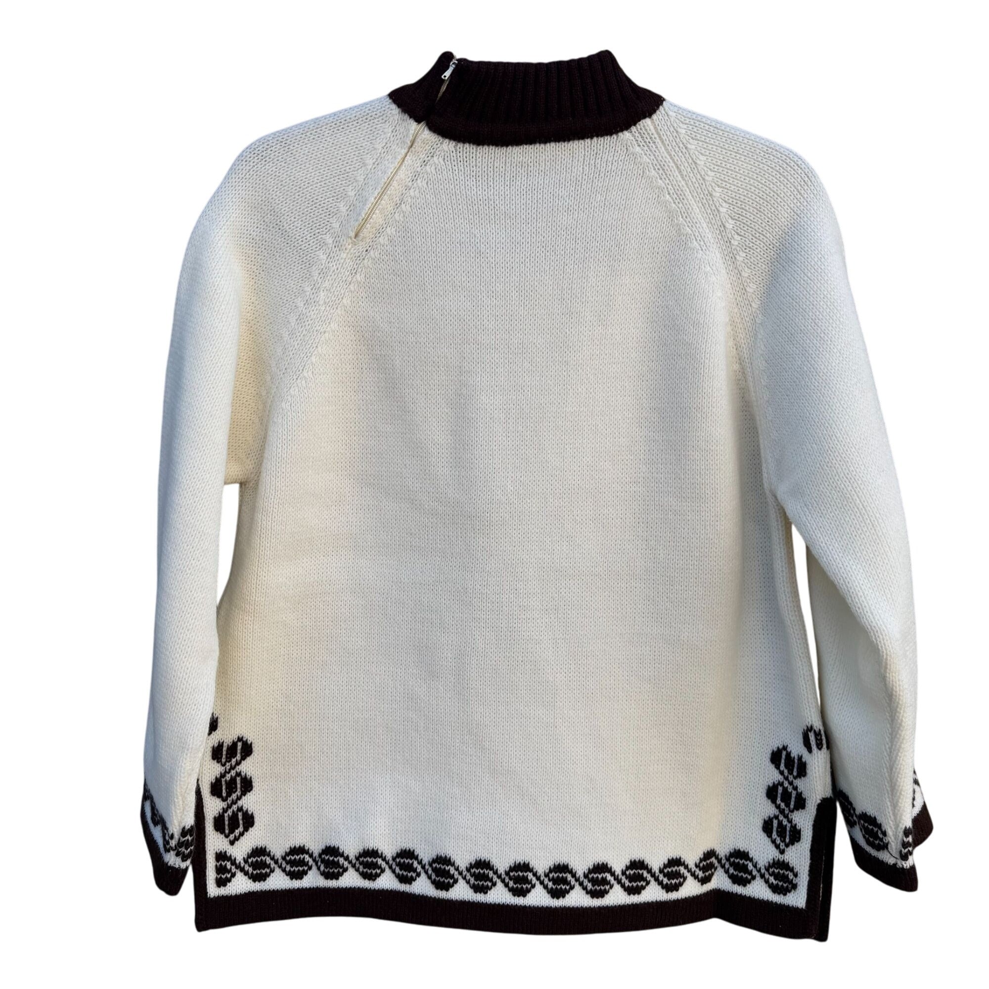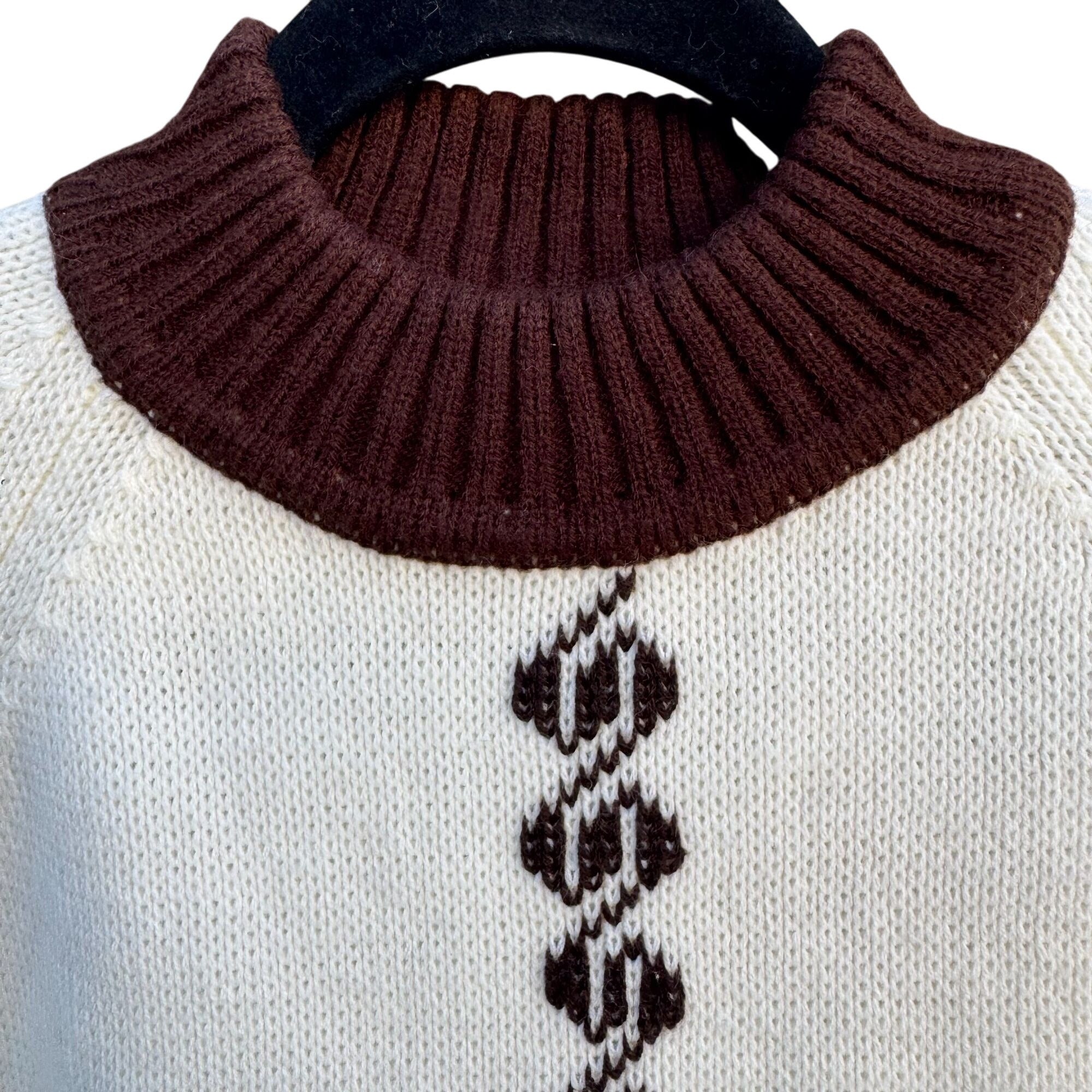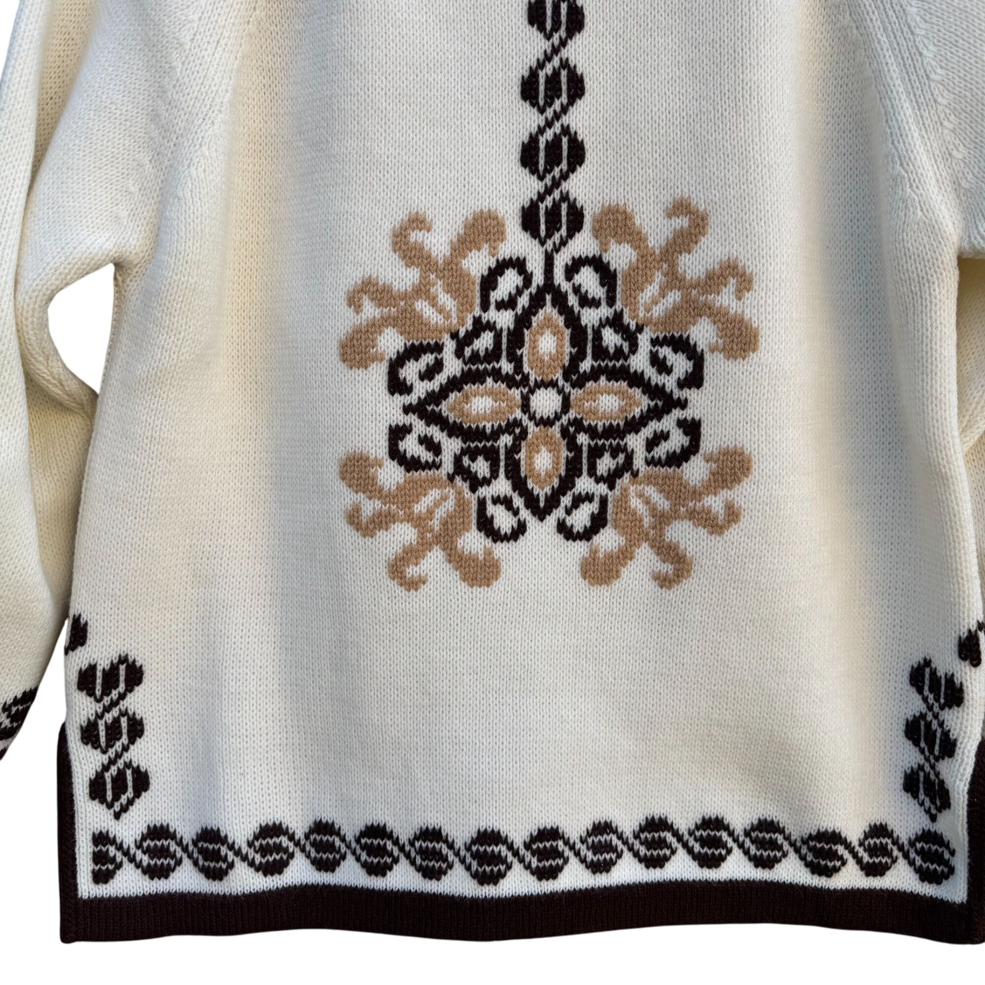 Vintage 60s 70s Cream Brown Knit High Zip Collar Geometric Nordic Ski Sweater XL
