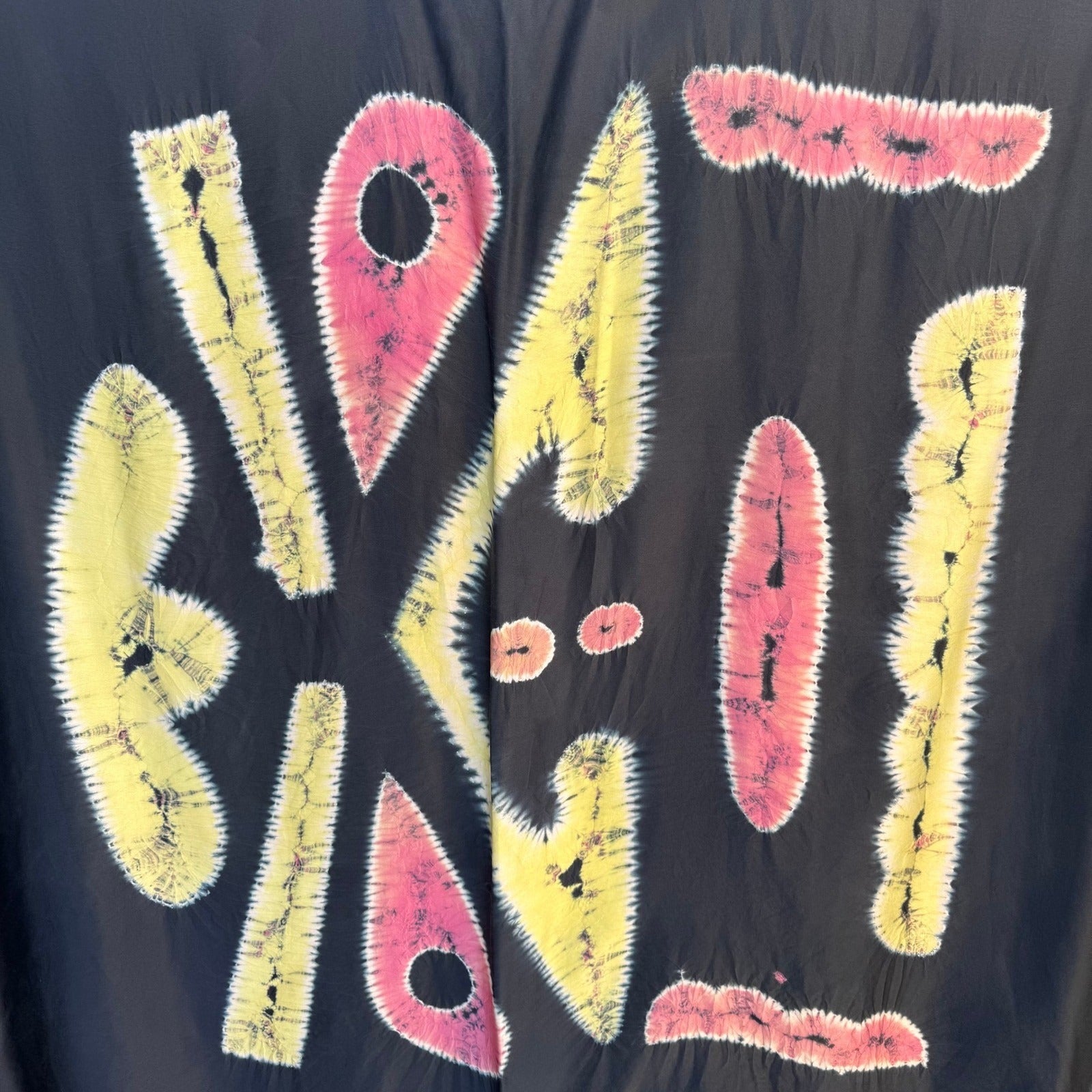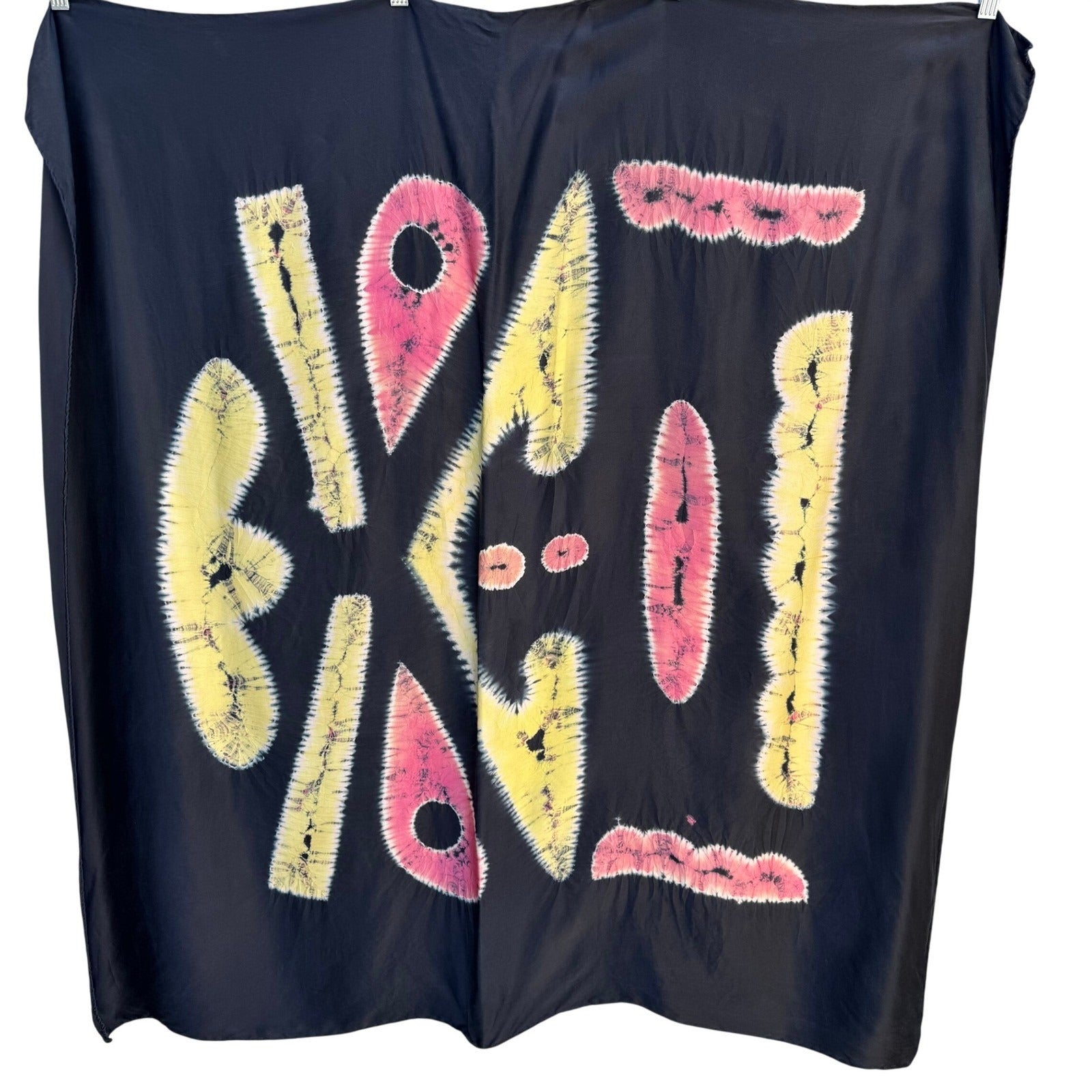 Handcrafted batik sarong/wrap/scarf features a vibrant abstract geometric pattern in pink and yellow against a deep black background. This versatile piece is made from a lightweight, soft fabric that drapes beautifully, making it ideal as a beach cover-up, wrap skirt, or decorative wall hanging. The intricate tie-dye detailing showcases unique artisan craftsmanship with bold shapes and textured edges.