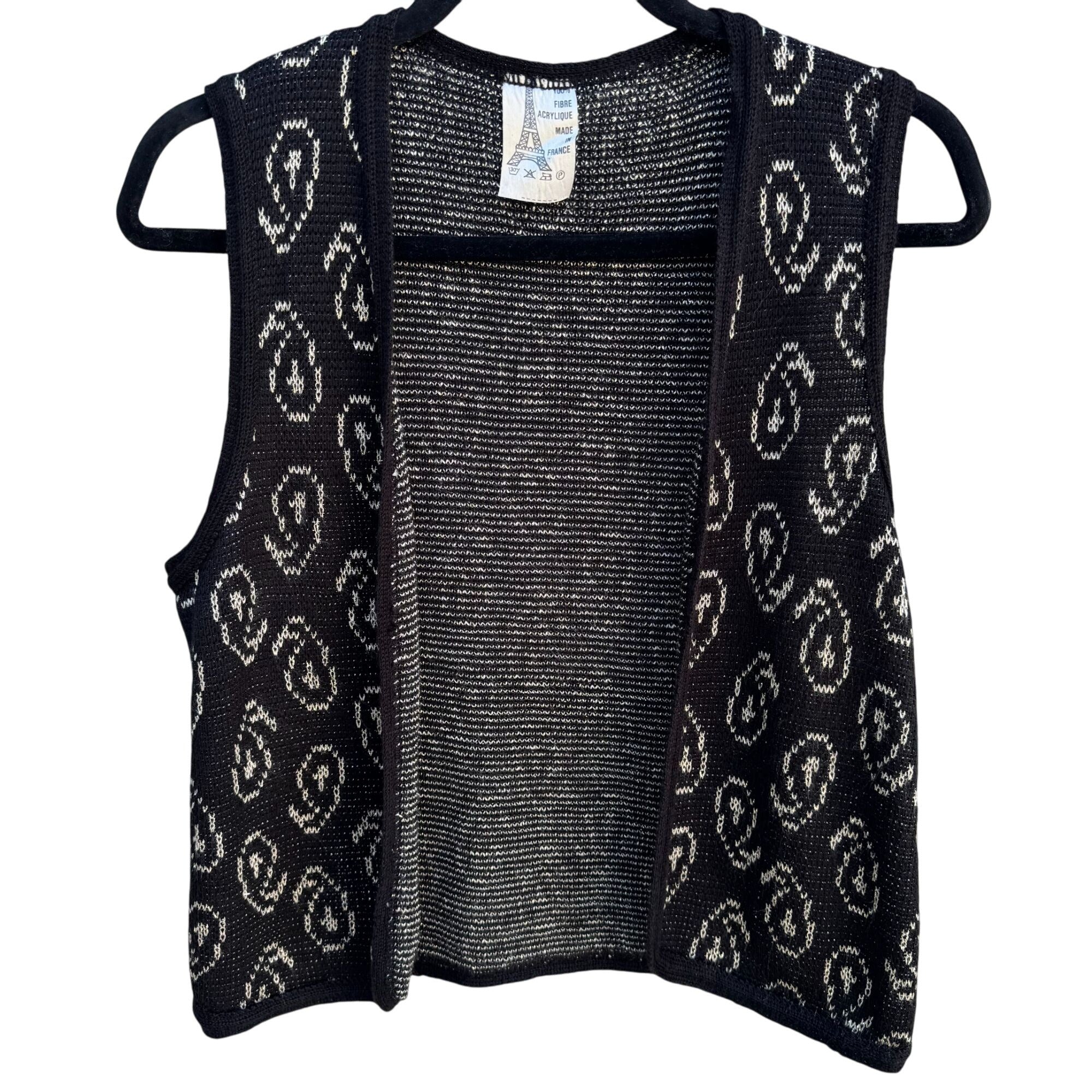 Vintage Womens Black Open Front Knit Abstract Metallic Print Made In France Vest