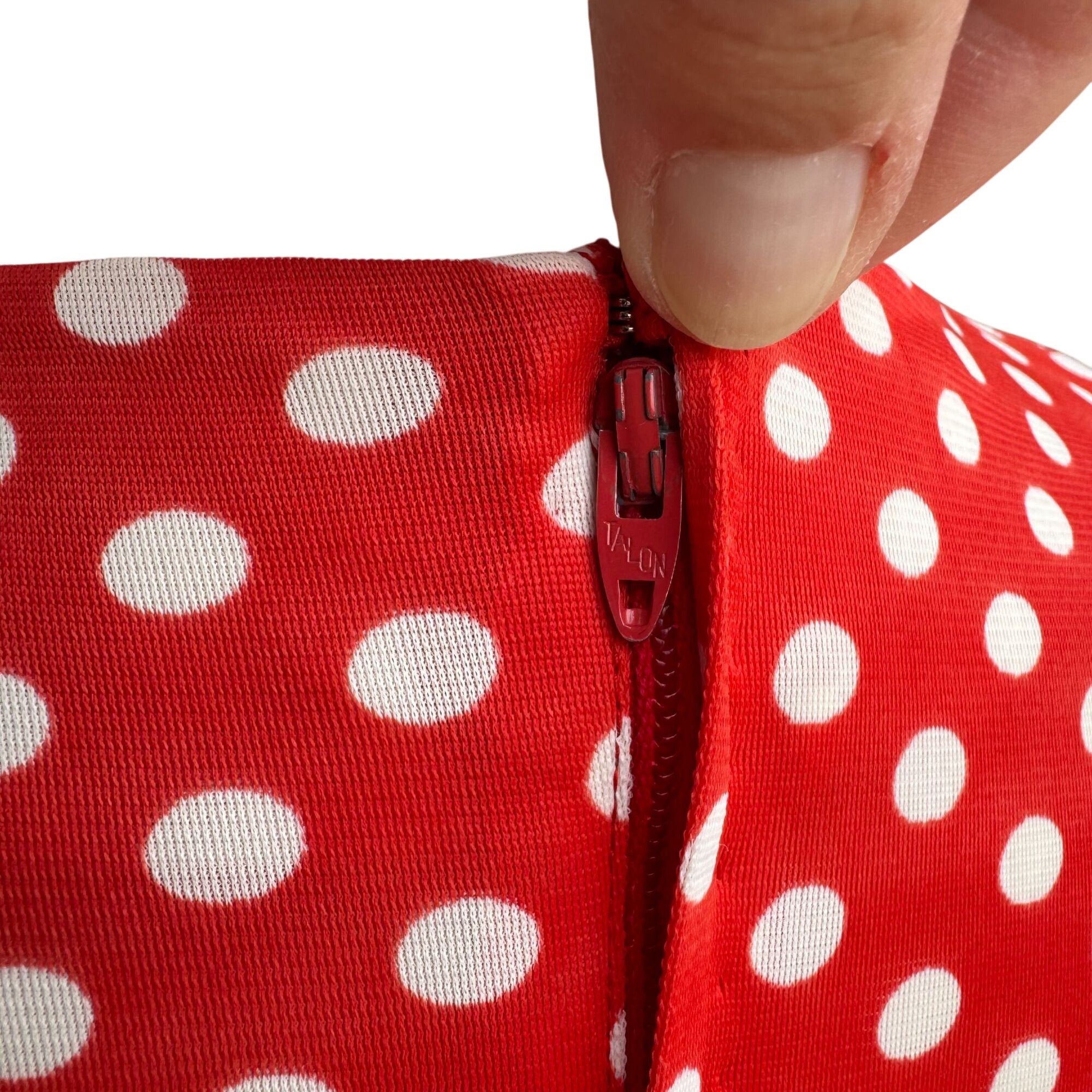 Vintage Womens Red & White Polka Dot V Neck Tie Waist Sleeveless Midi Dress