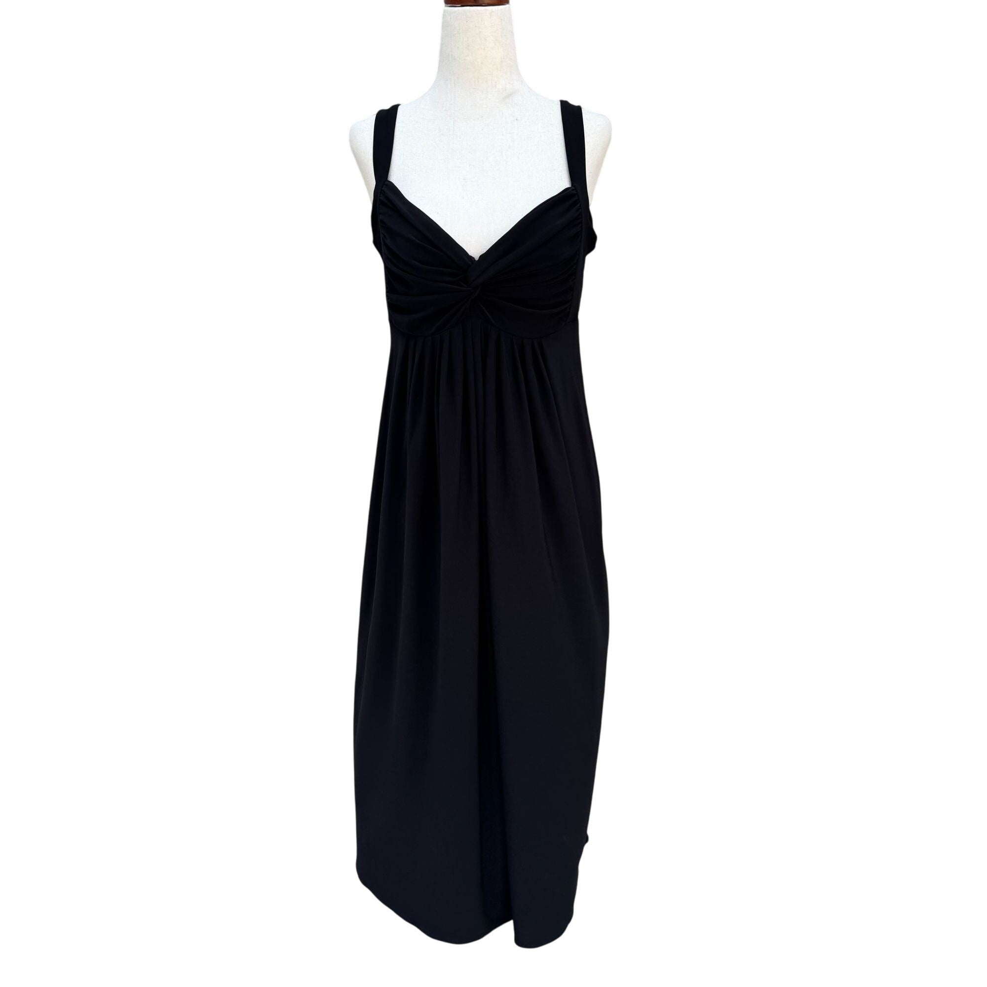 A timeless black midi dress featuring a ruched bust design and adjustable straps. Ideal for a variety of formal or semi-formal occasions.